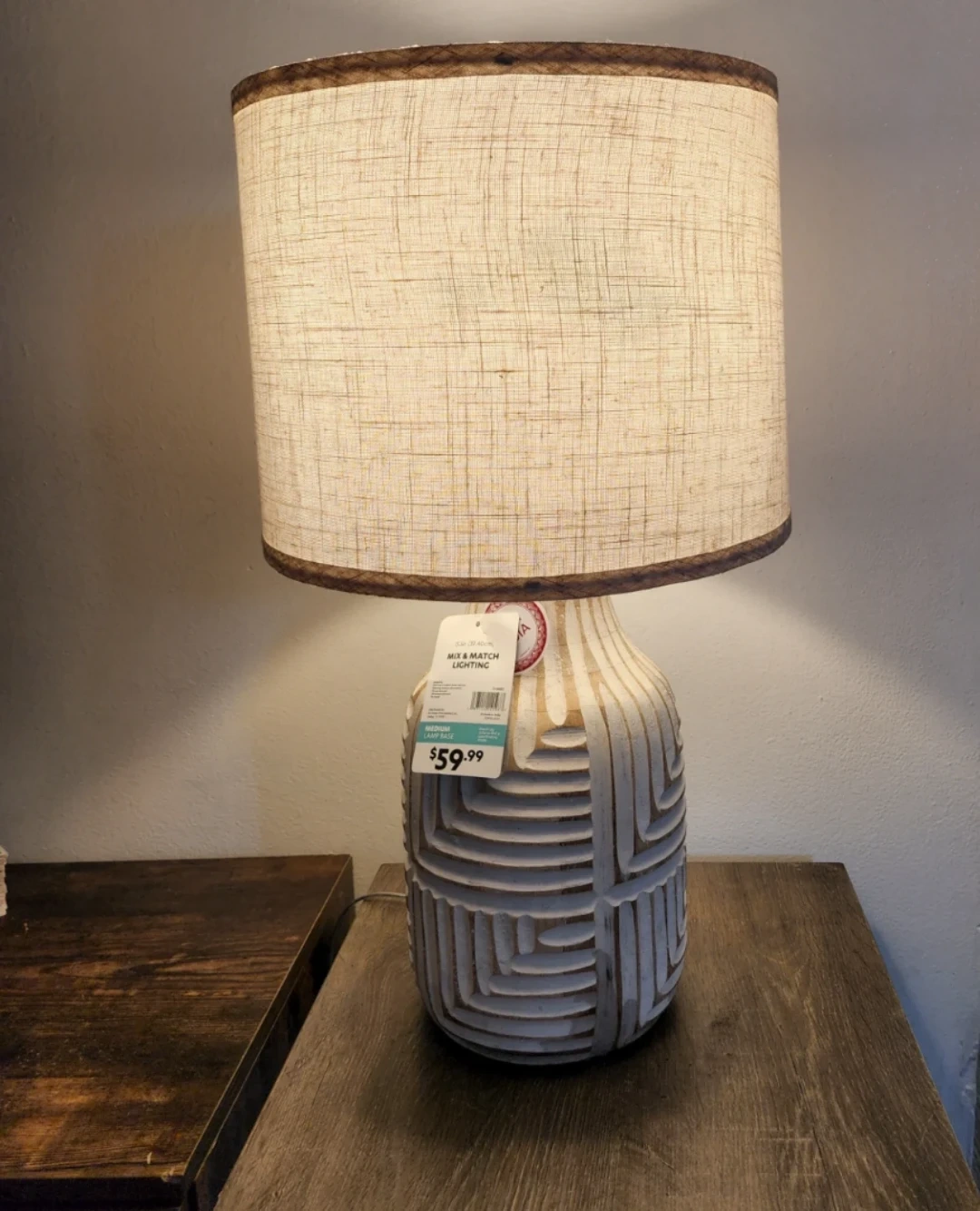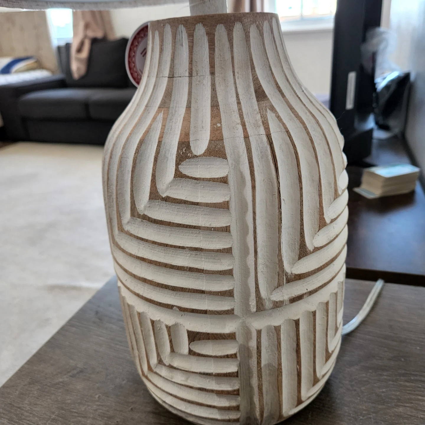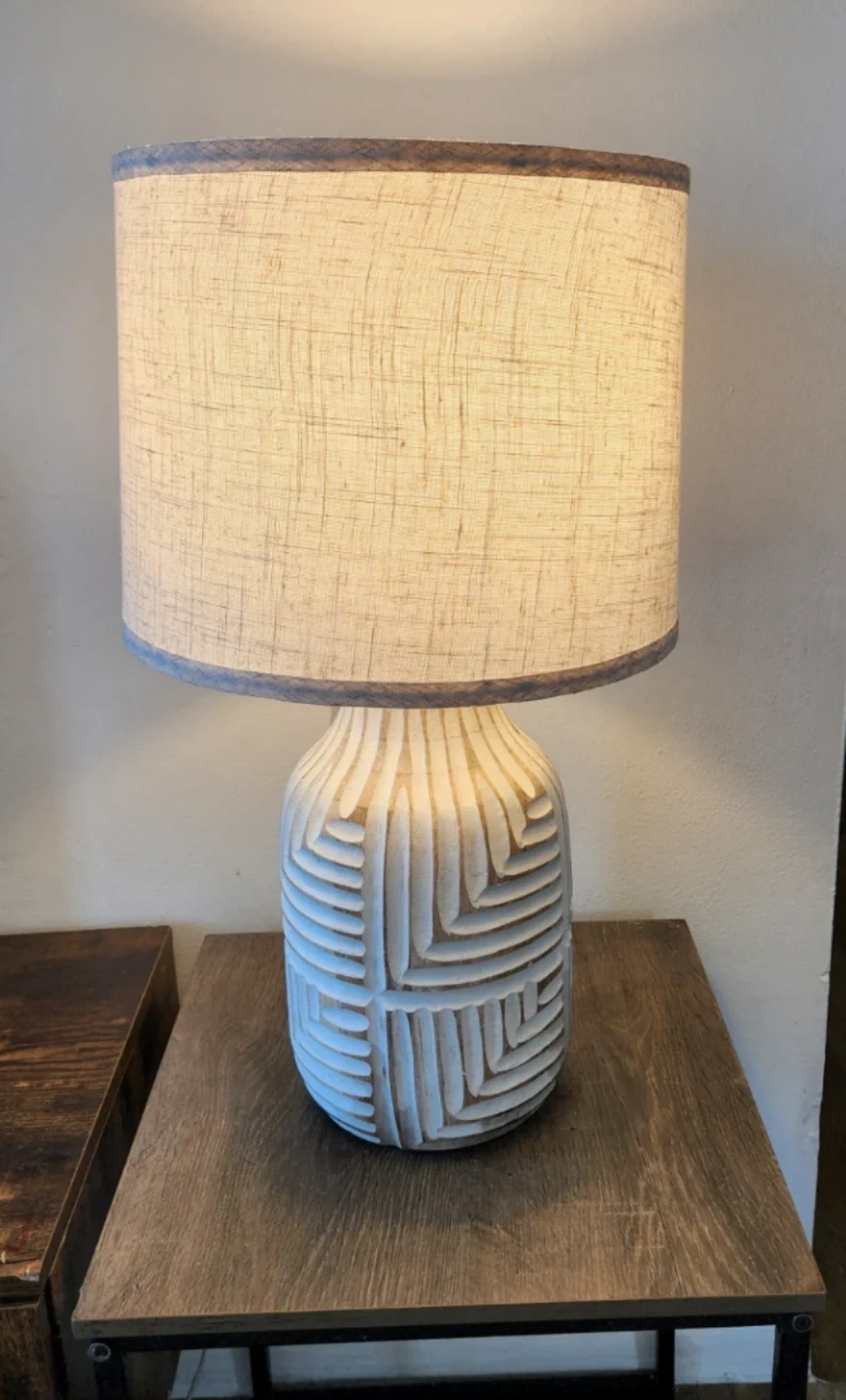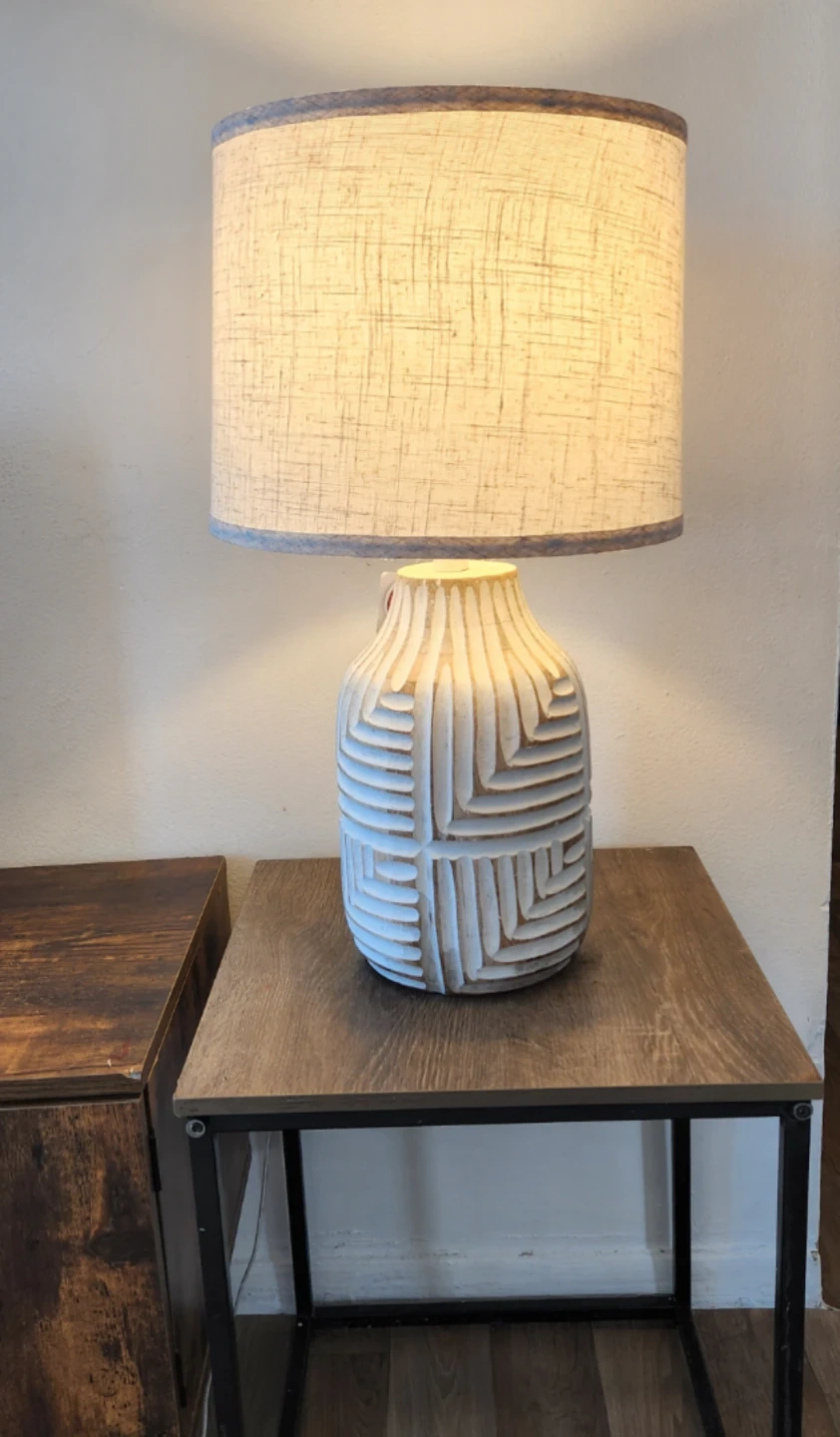 Brand new 2 lamps.This table lamp features a carved ceramic base with a textured drum shade. It's a decorative piece that adds a warm glow to any room. The base has a distressed white finish over wood.lil bit structures as show in the pictures but is not affected.each 30 both for 50.cash only