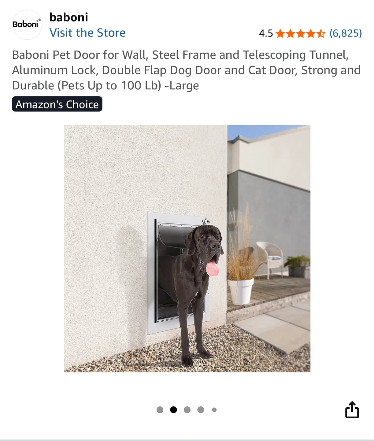 Baboni large pet door for wall. Features a steel frame and telescoping tunnel. It's a double flap dog and cat door, suitable for pets up to 100 lbs. Made with durable aluminum lock.