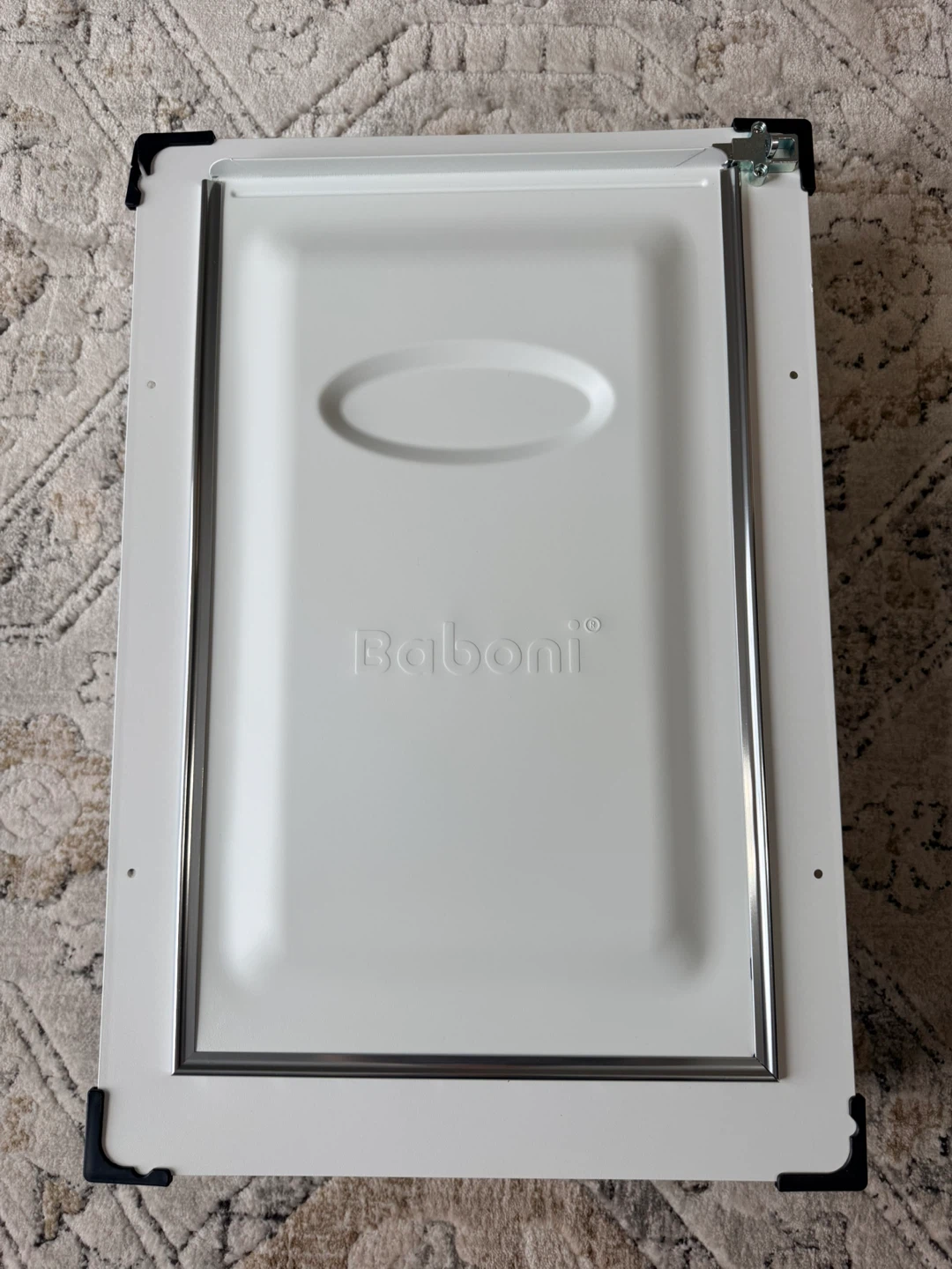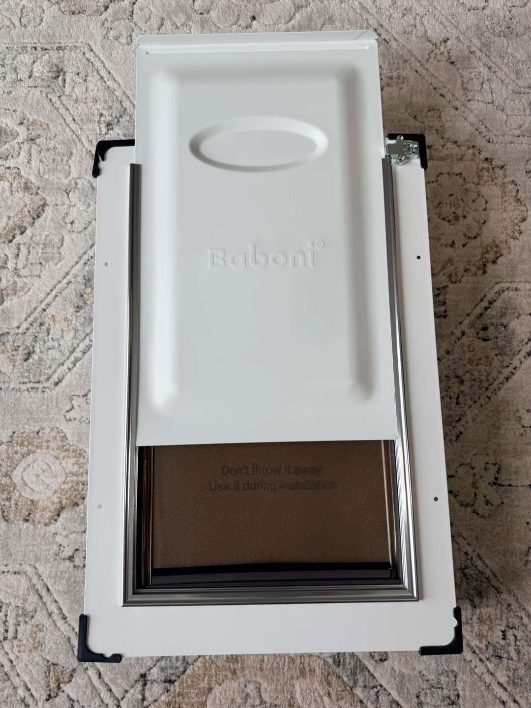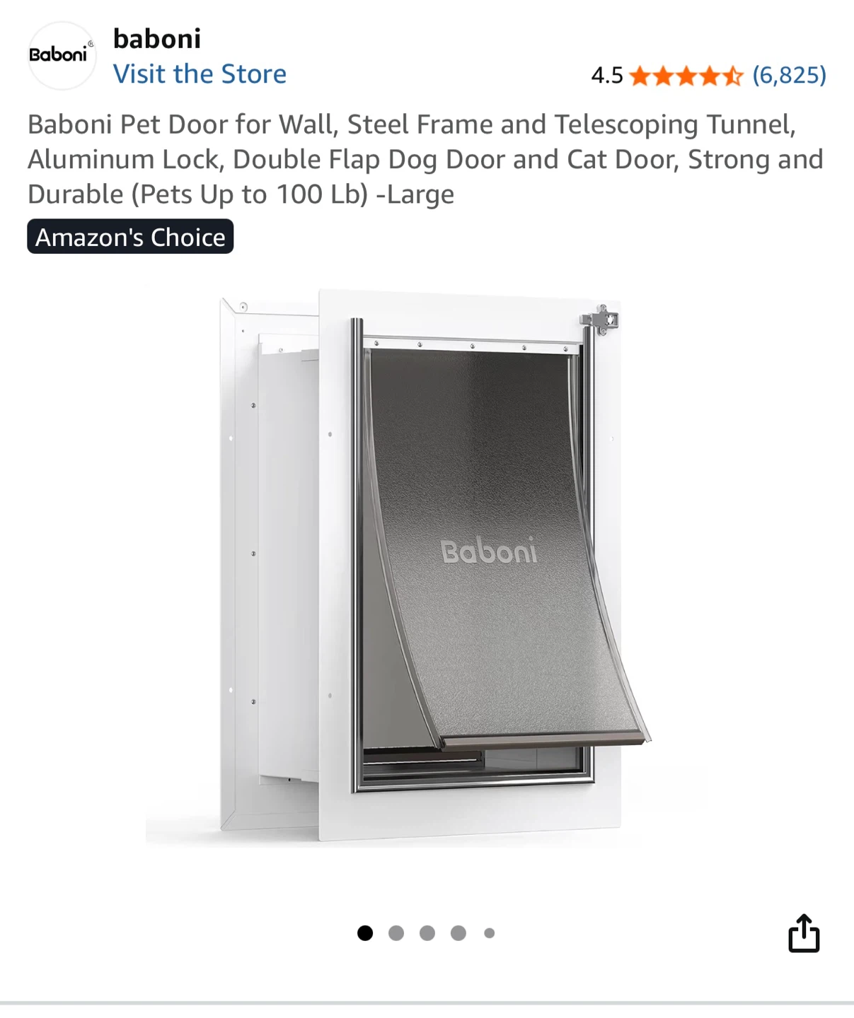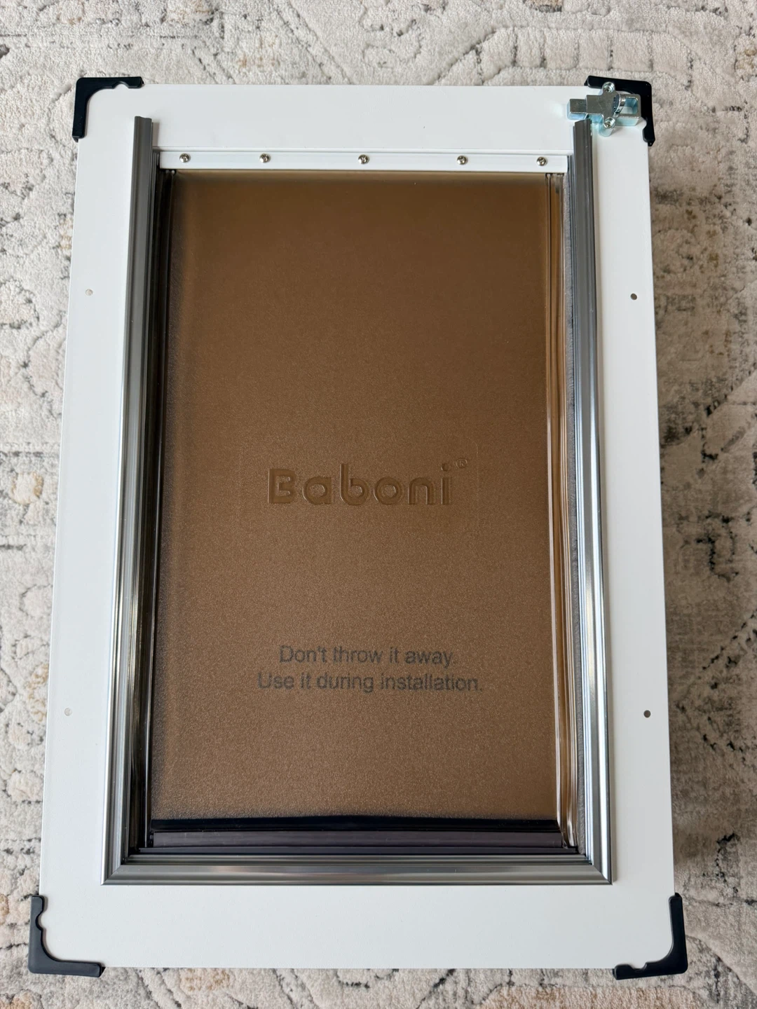 Baboni large pet door for wall. Features a steel frame and telescoping tunnel. It's a double flap dog and cat door, suitable for pets up to 100 lbs. Made with durable aluminum lock.