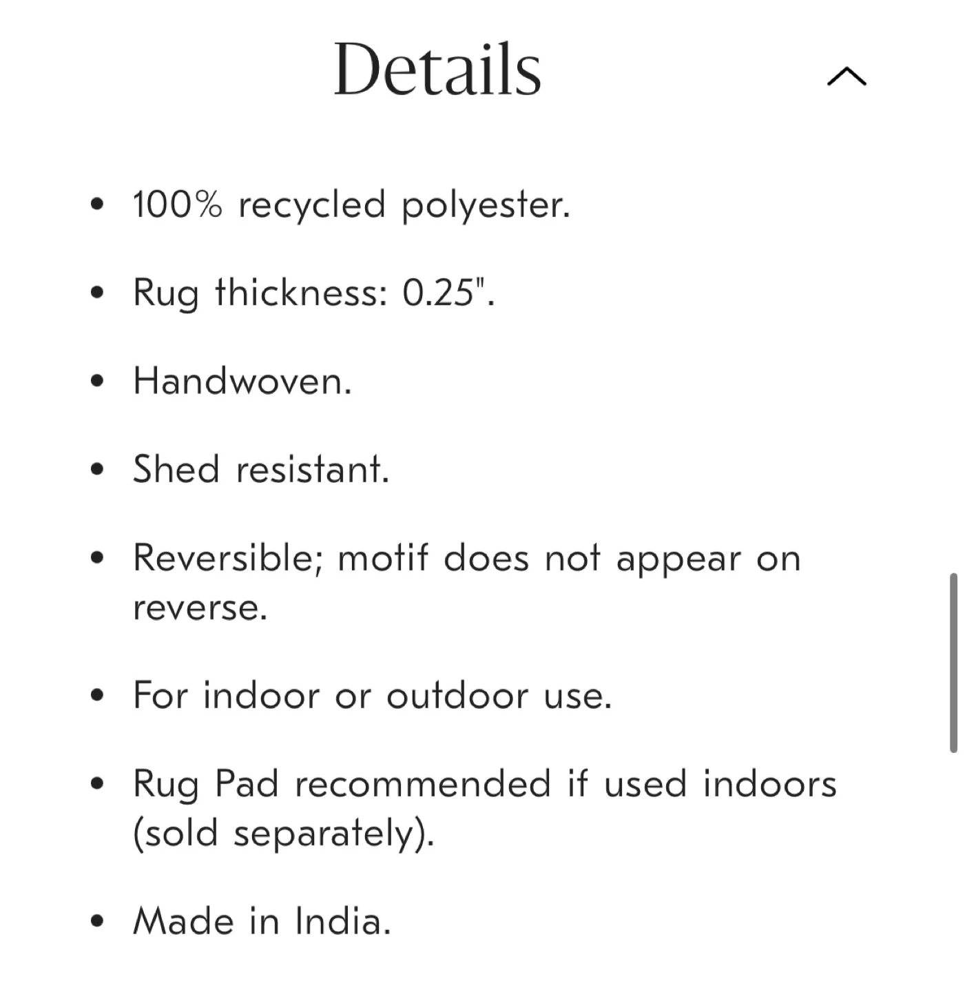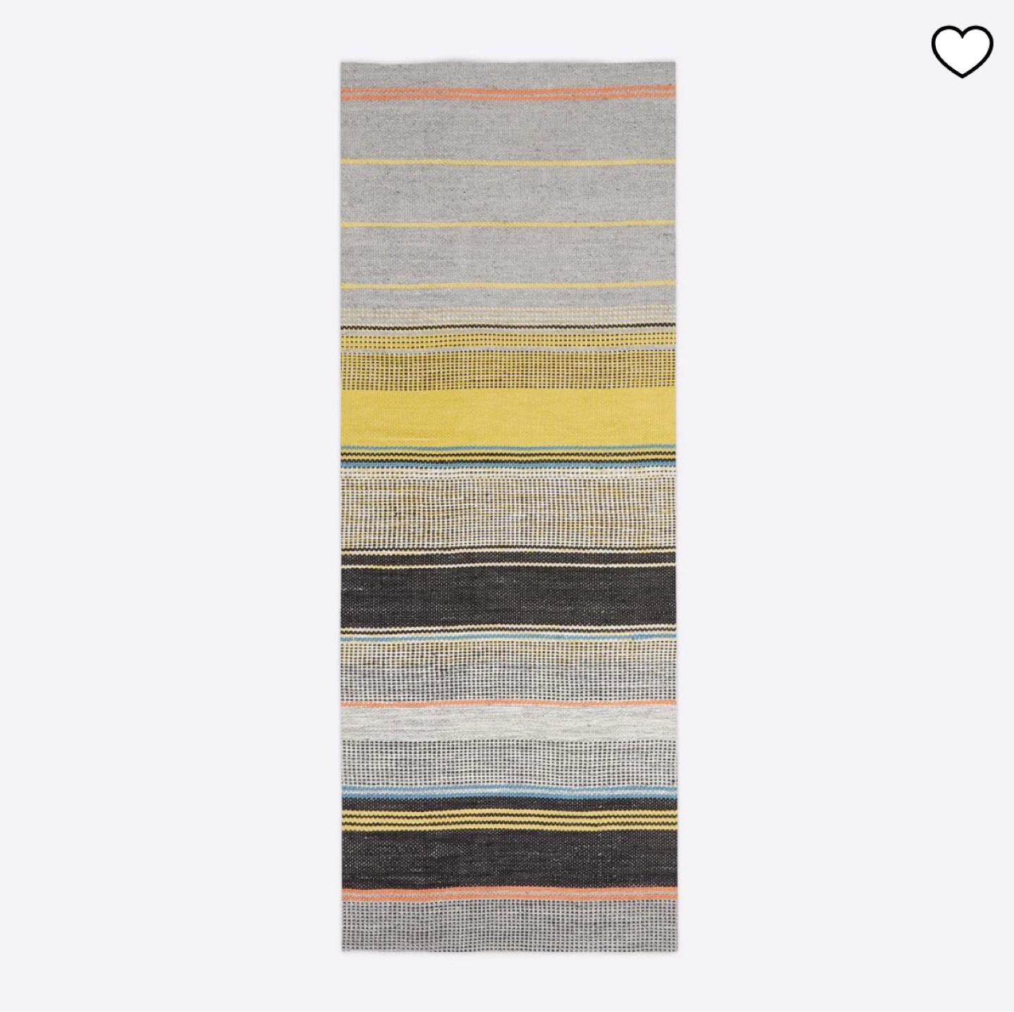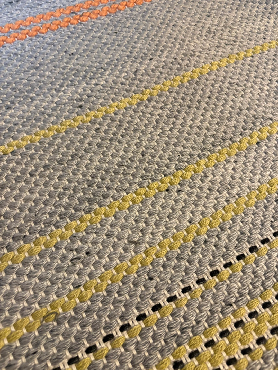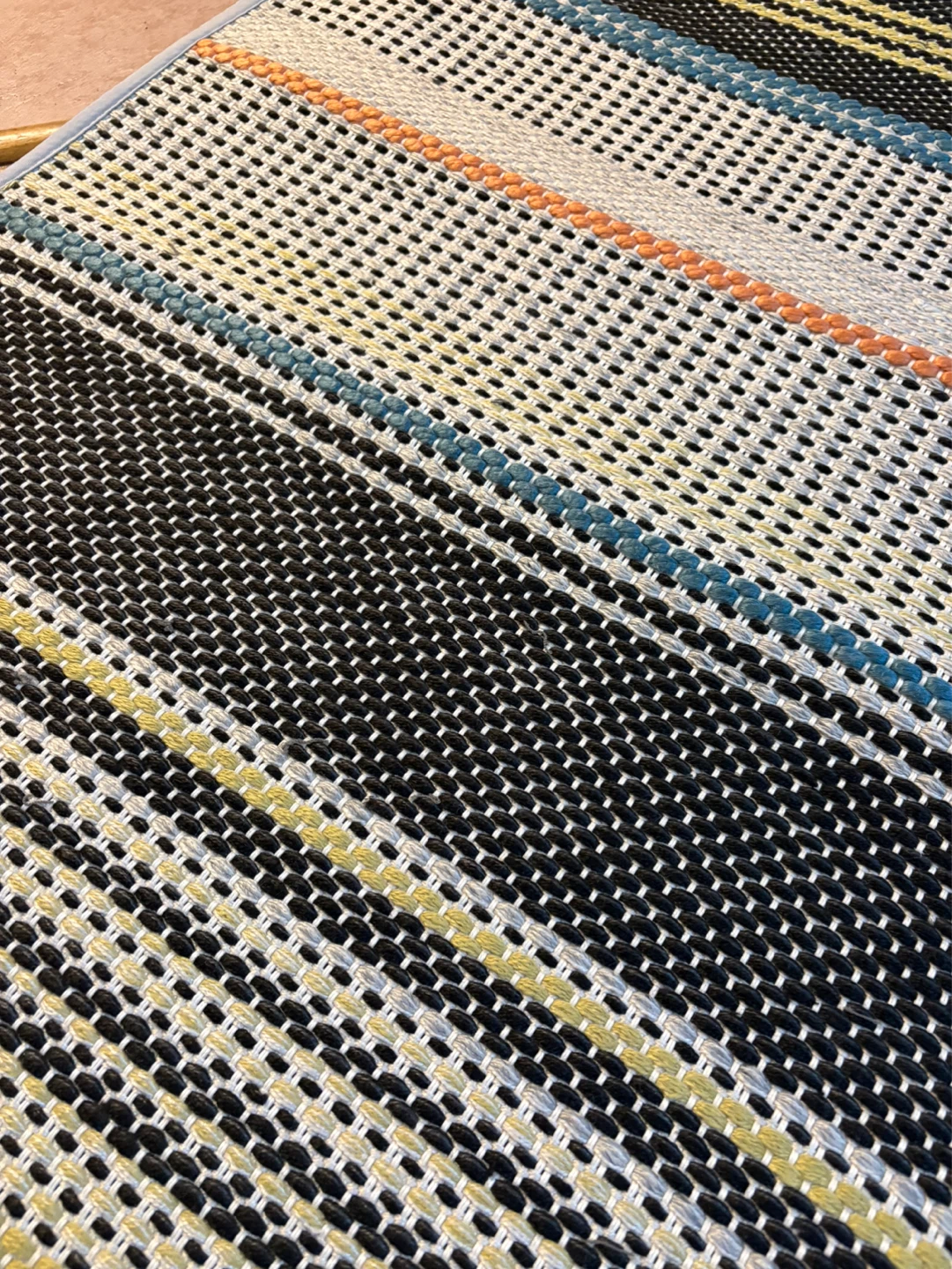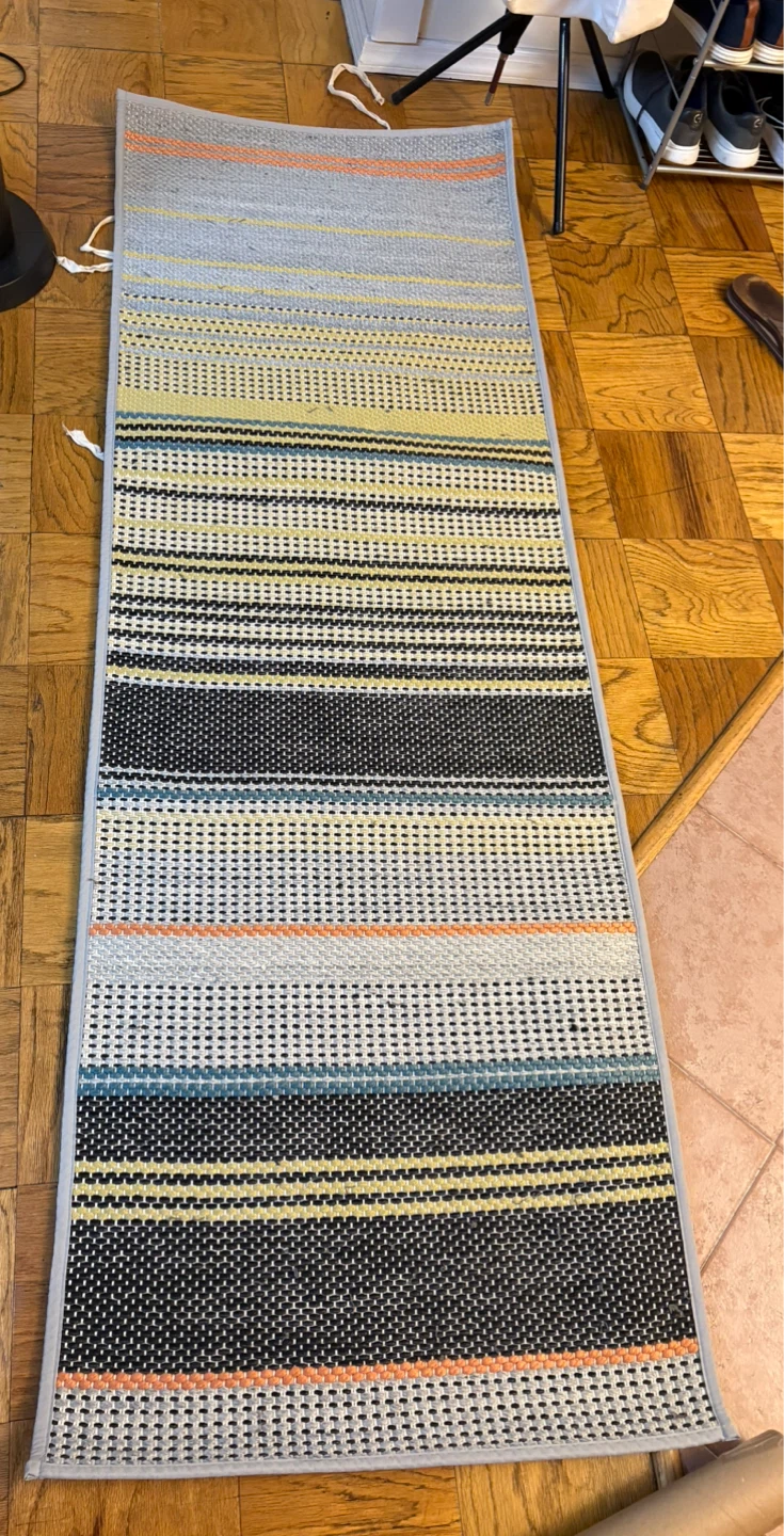 Colorful handwoven runner rug made from 100% recycled polyester. It's shed resistant, suitable for indoor or outdoor use.