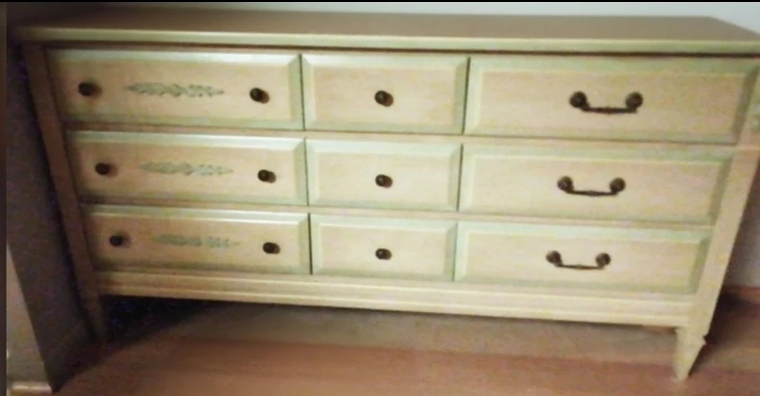 This dresser has a yellowish cream finish with light green accents and decorative detailing on some drawers. It features 9 drawers with dark hardware. Plenty of storage space available!