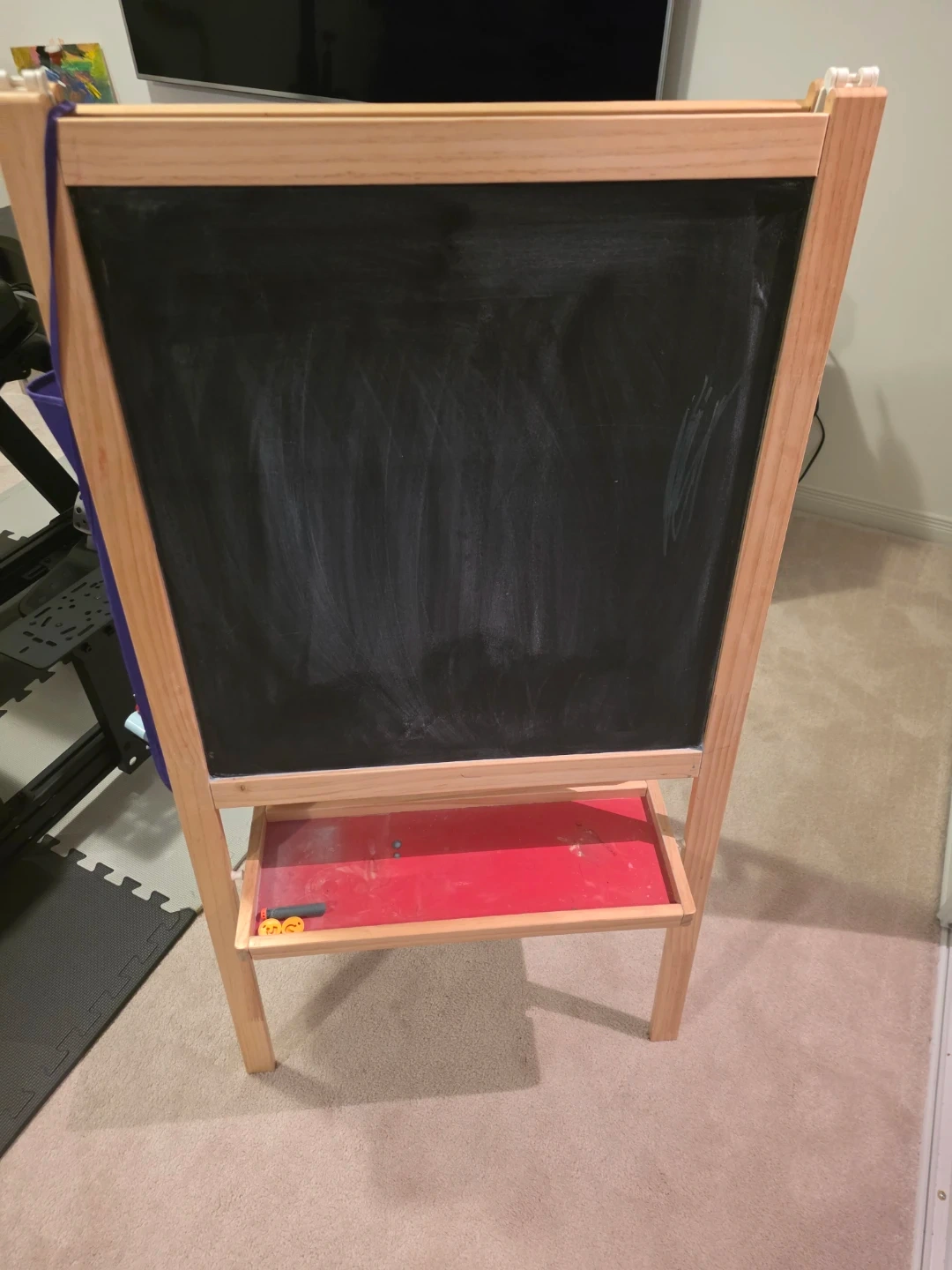 This sturdy wooden easel features a chalkboard and a whiteboard surface. It includes a red tray for art supplies and comes with some chalk and magnetic letters. It's perfect for creative young minds!