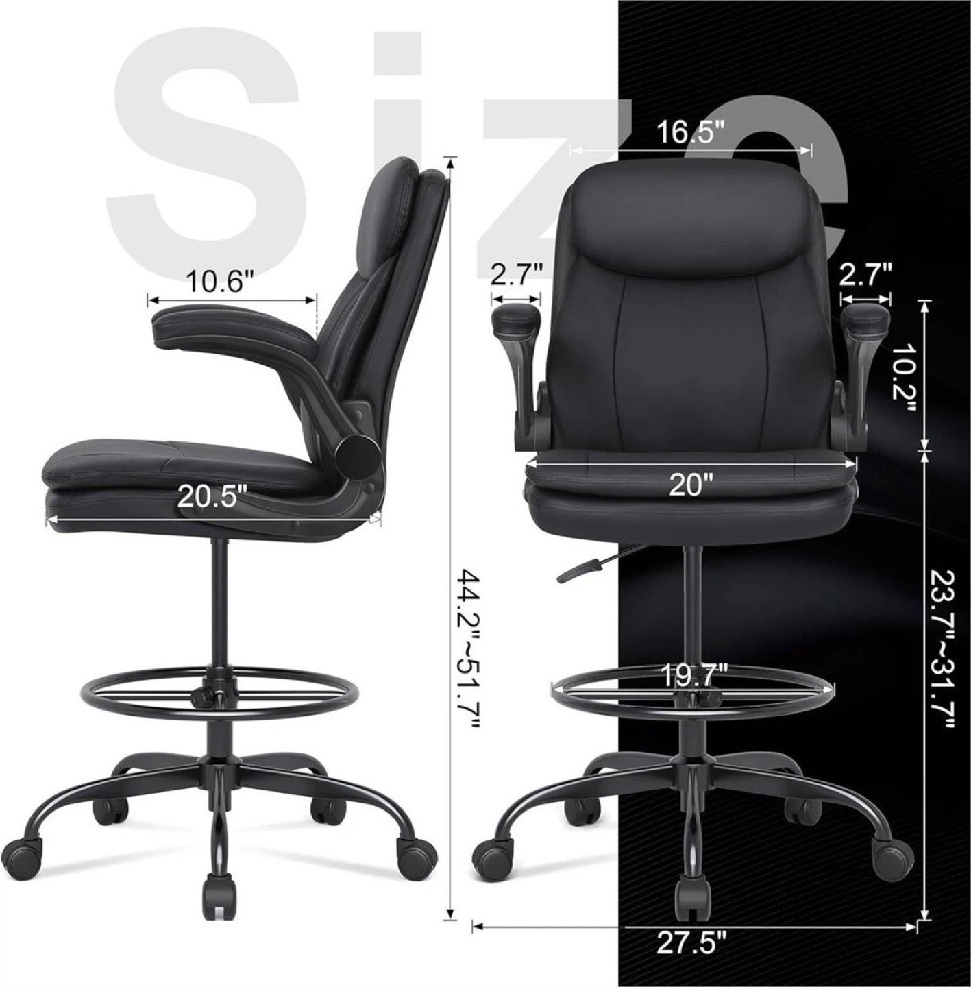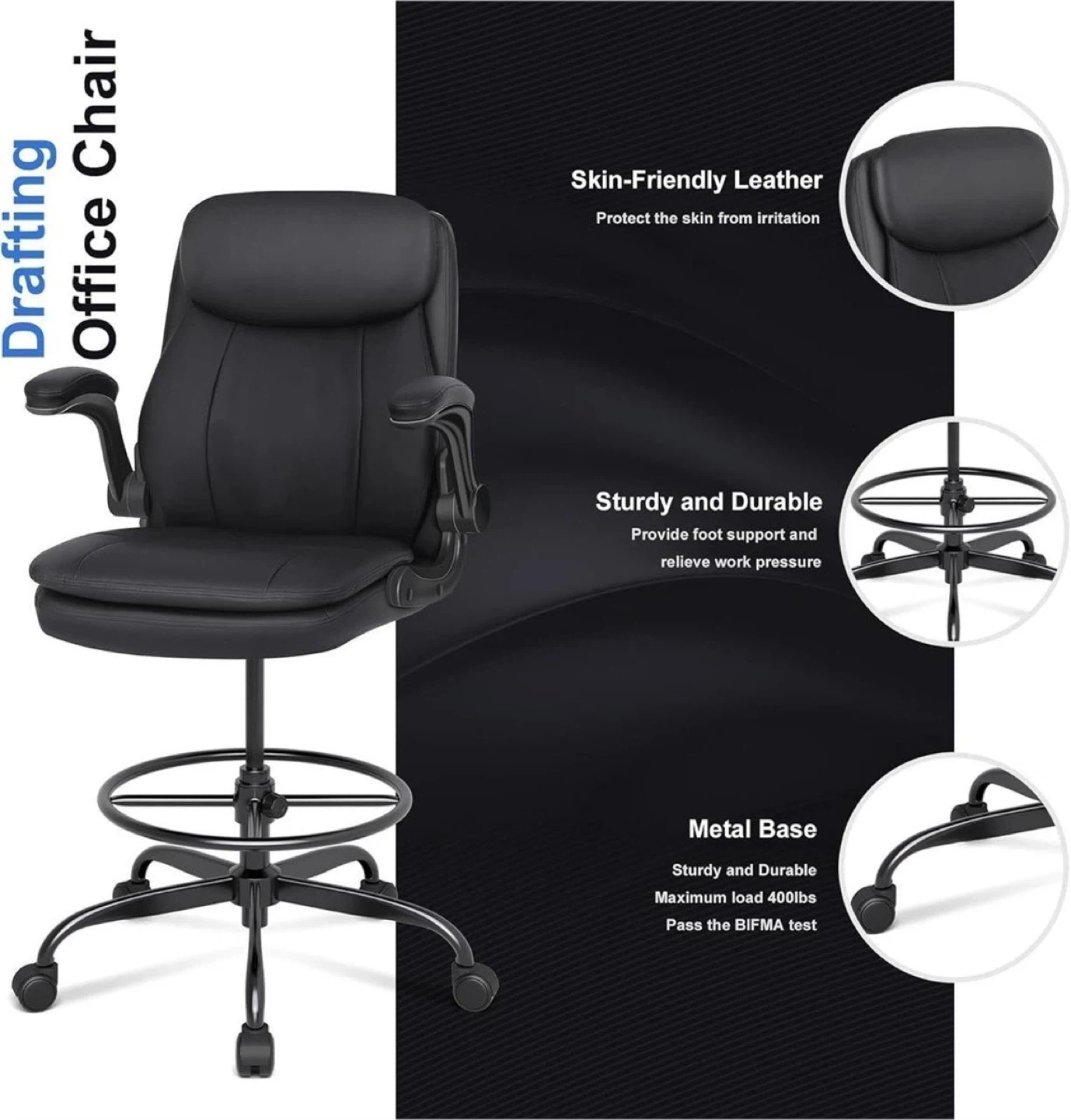 This black drafting office chair is made with skin-friendly leather and a sturdy metal base. It has a maximum load capacity of 400lbs and passes the BIFMA test. The adjustable height range is 44.2"-51.7" and the seat width is 20".