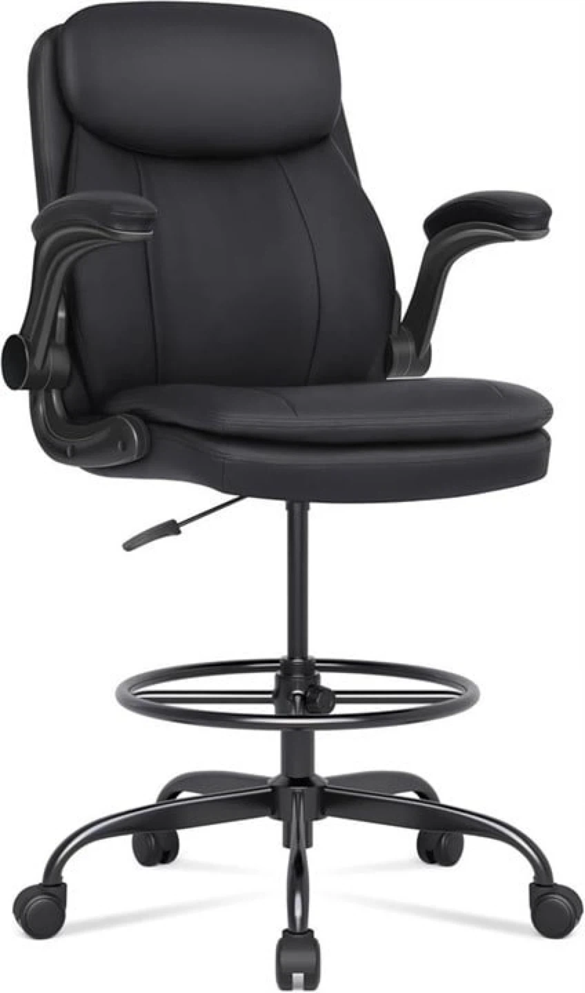 This black drafting office chair is made with skin-friendly leather and a sturdy metal base. It has a maximum load capacity of 400lbs and passes the BIFMA test. The adjustable height range is 44.2"-51.7" and the seat width is 20".