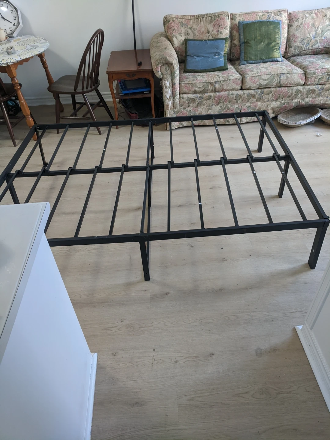 This is a black metal double bed frame. It features a sturdy metal construction with multiple support slats. Assembly is required, but it's straightforward. Noting: a bed leg is different from others. But it doesn't matter.I can deliver it to your house and fix it for you. The delivery is free!!