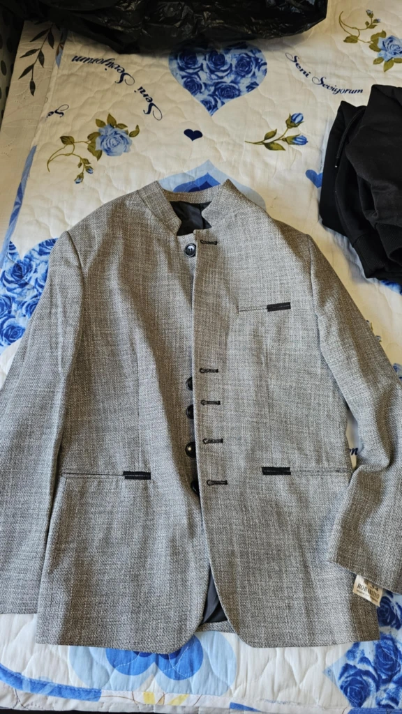 Grey blazer with black trim and buttons. Mandarin collar and five buttons down the front. Two pockets on the front. Size 9.