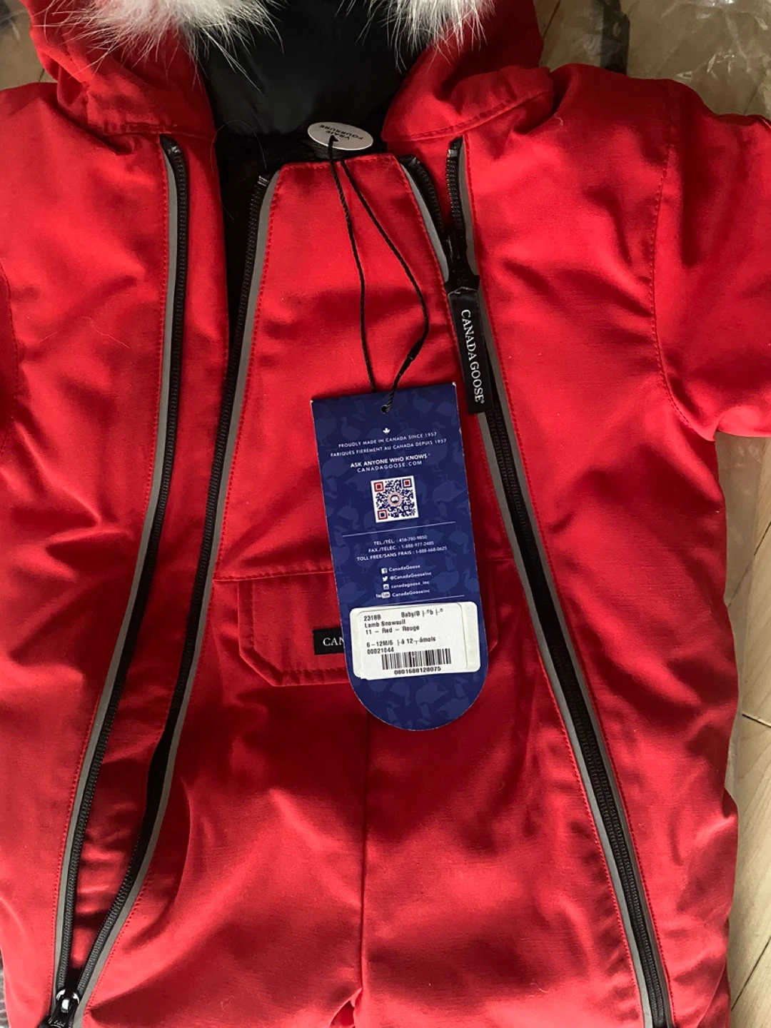 Keep your little one warm this winter with a Canada Goose baby snowsuit! This adorable snowsuit is in excellent condition and perfect for babies aged 6-12 months. It's a vibrant red colour and ready for all your winter adventures