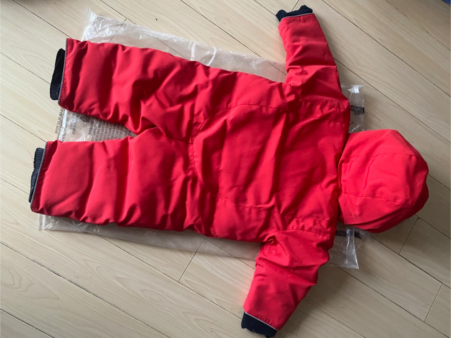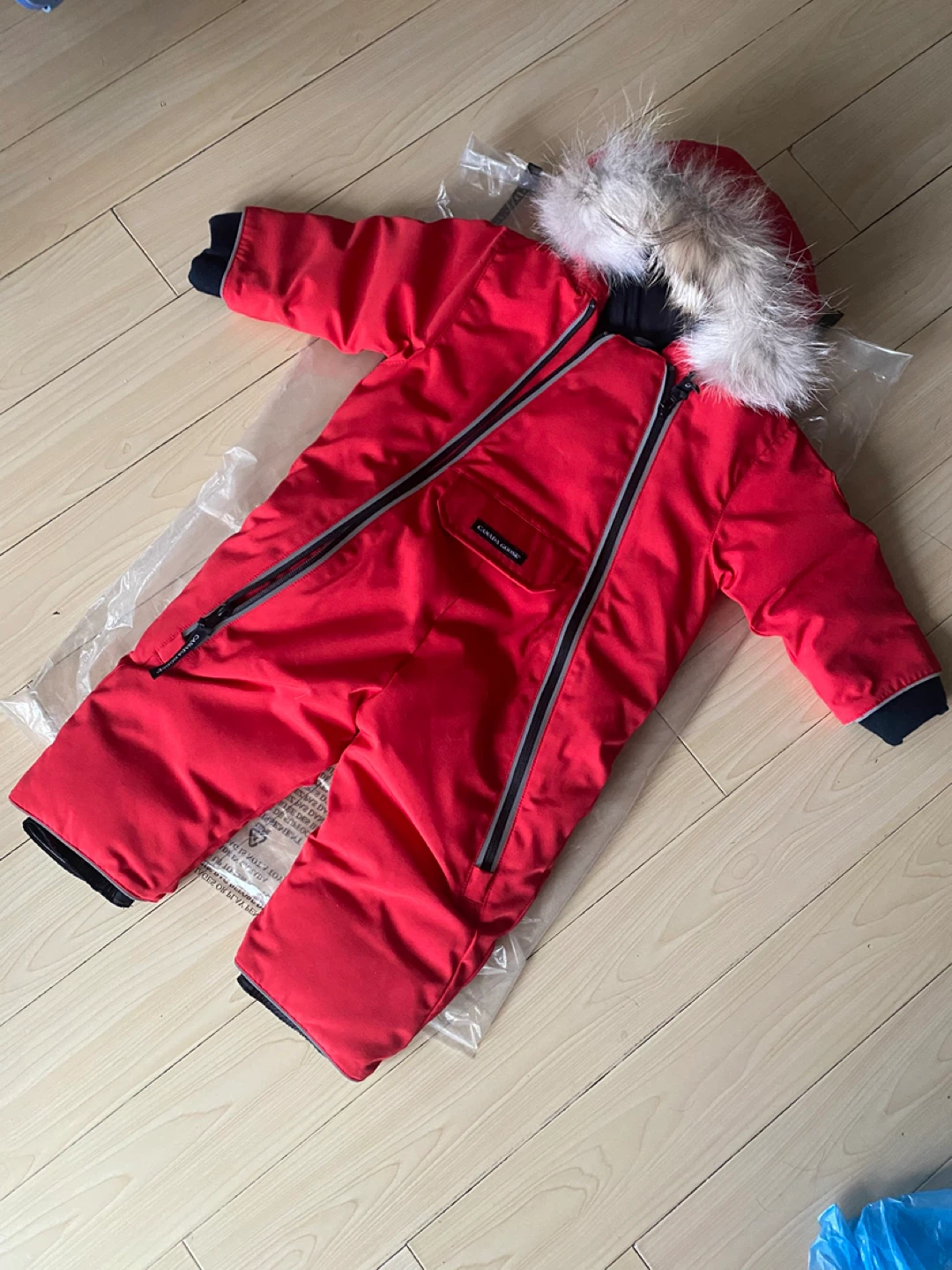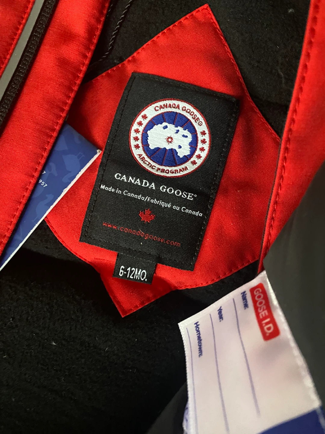 Keep your little one warm this winter with a Canada Goose baby snowsuit! This adorable snowsuit is in excellent condition and perfect for babies aged 6-12 months. It's a vibrant red colour and ready for all your winter adventures