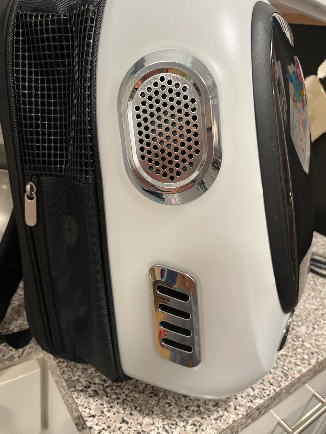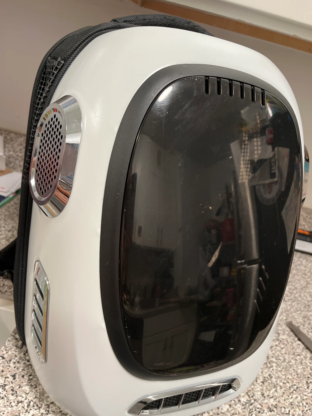 This is an Insta-Hew pet carrier backpack. It's designed with ventilation for your pet's comfort. The backpack features a clear dome to let your pet see out.