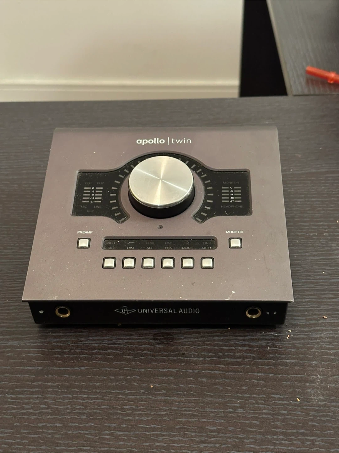 Universal Audio Apollo Twin audio interface. This unit is designed for professional audio recording and monitoring. It's great for musicians and producers. It comes with multiple input and output options.