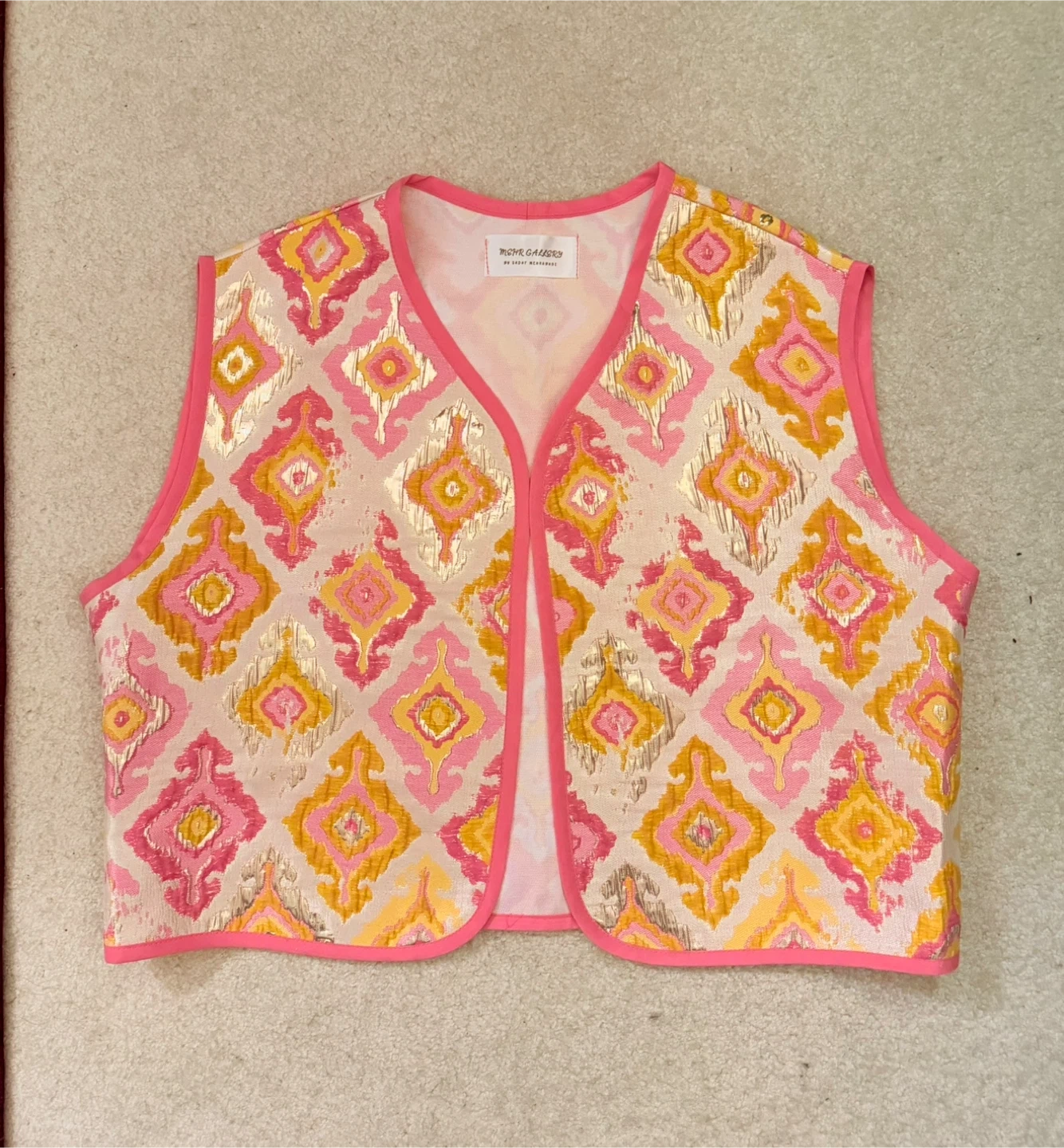 Buy & SellPink Gold Diamond Pattern VestPink Gold Diamond Pattern Vest$15This vest features a striking diamond pattern in pink, yellow, and gold. It's trimmed with a bright pink binding. The material has a metallic sheen.ConditionNewBrandMehr GalleryWHERE TO MEETCheck LocationView MapSELLERverifiedShellCentral Lonsdale893 reviews0 chats·0 favorites·5 viewsSEND CHAT TO SELLERHi Shell! I’m interested in your listing.Hi Shell! I’m interested in your listing.Get the Karrot app to chatSign In to chat