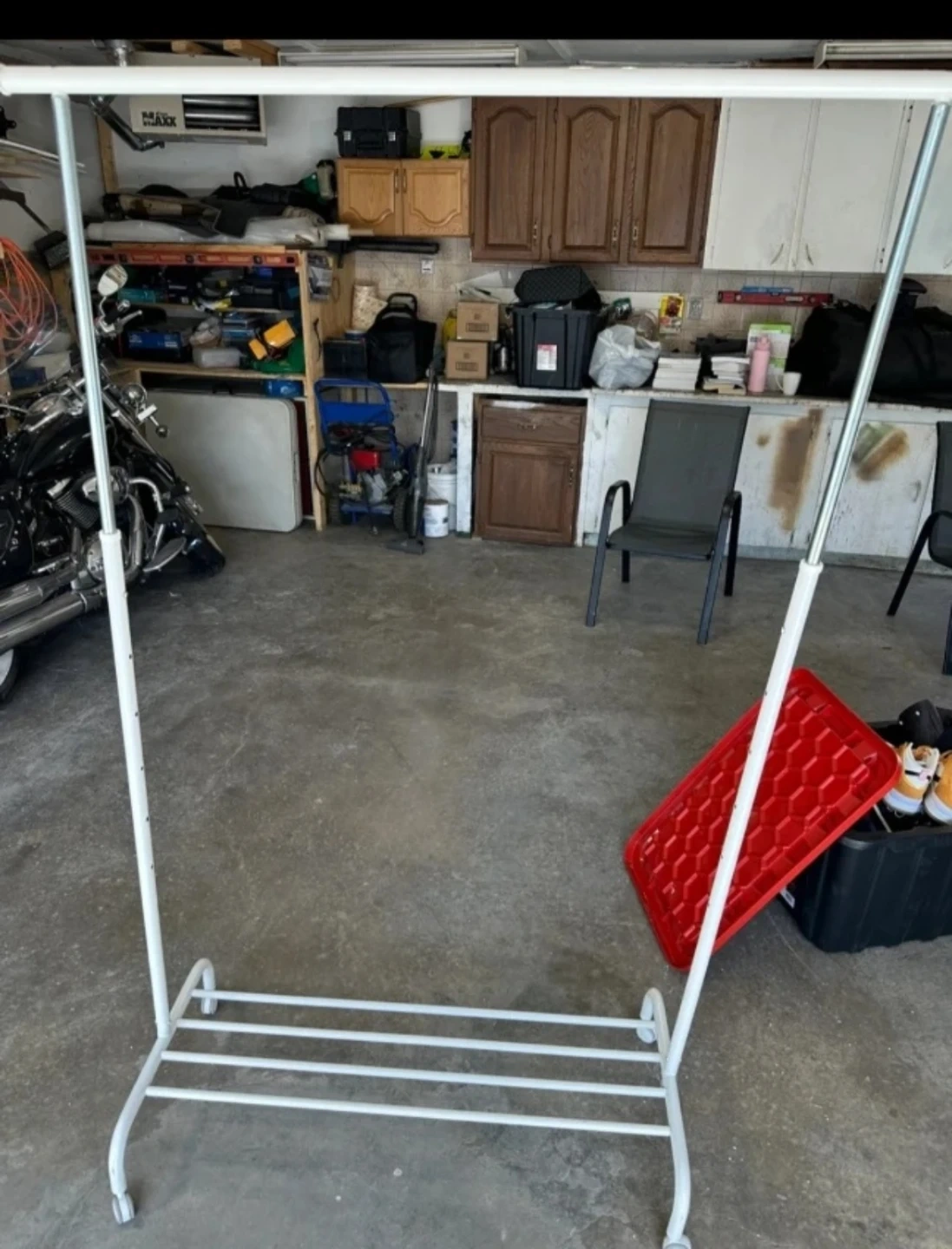 This is a white metal garment rack. It features a top bar for hanging clothes and a lower shelf with multiple bars for storing shoes or folded items. It's a handy piece for organizing your space!