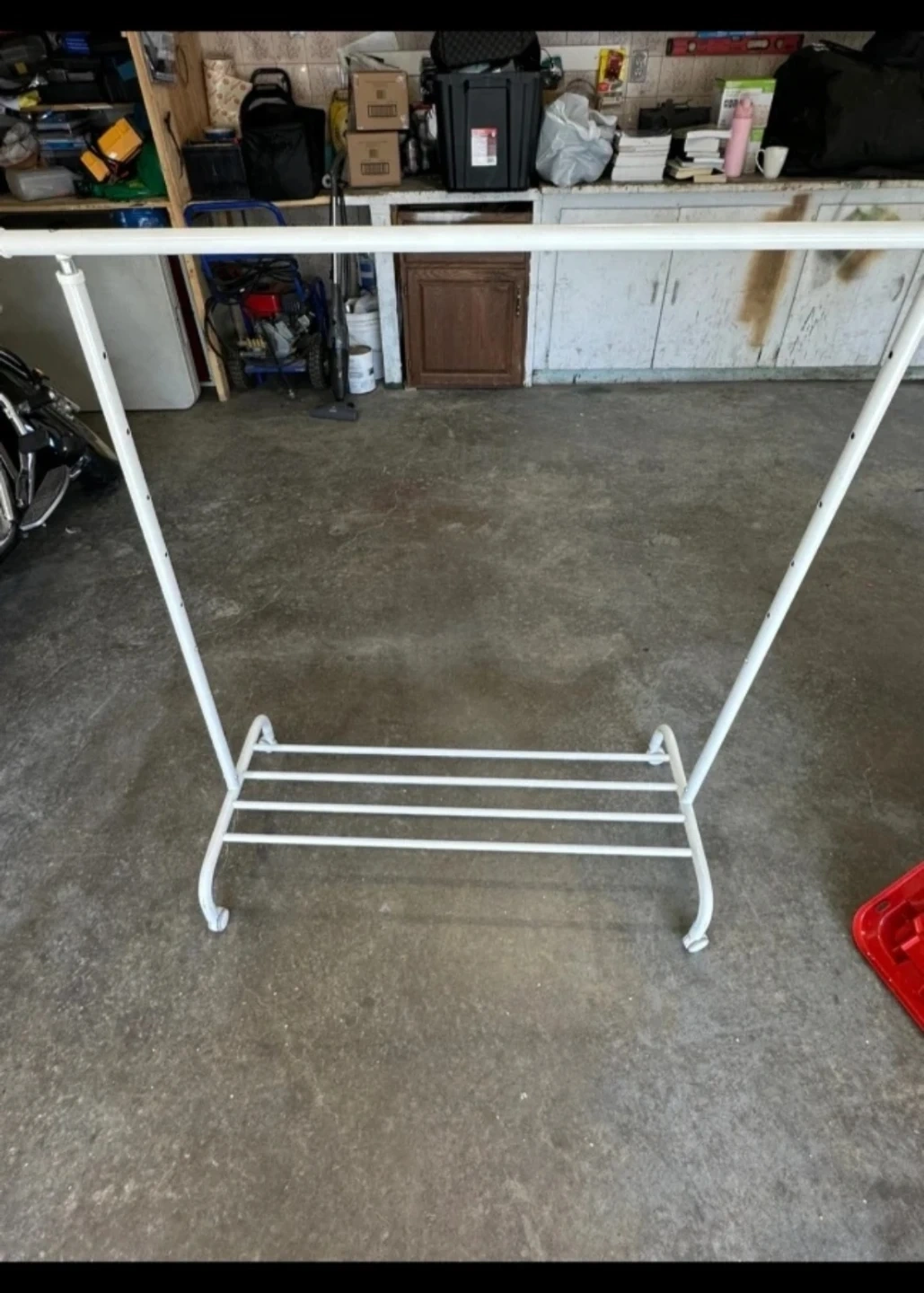 This is a white metal garment rack. It features a top bar for hanging clothes and a lower shelf with multiple bars for storing shoes or folded items. It's a handy piece for organizing your space!