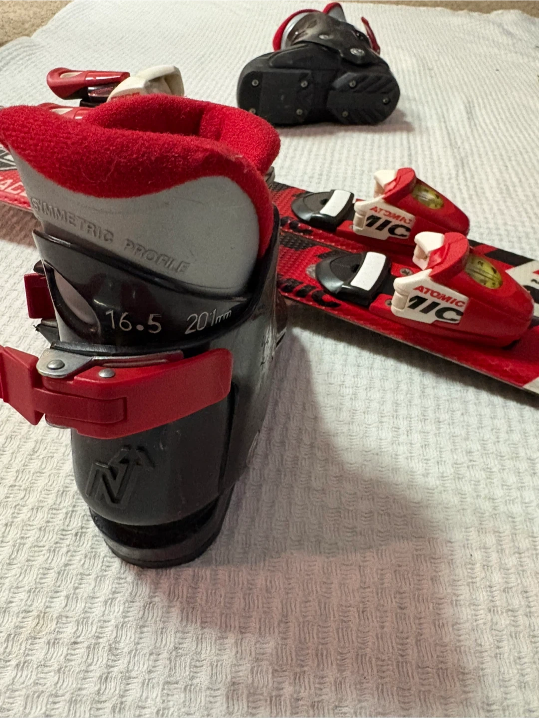 This is a set of Atomic Race 5 skis and boots. Perfect skis and boots for a child age 3-4. Boots size 16.5. Skis 80cm.