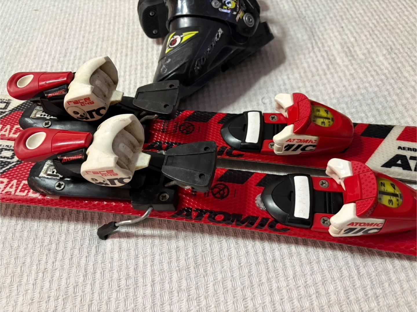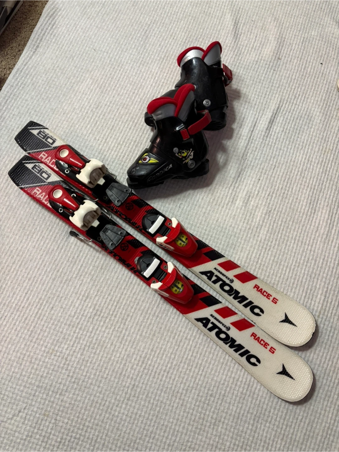 This is a set of Atomic Race 5 skis and boots. Perfect skis and boots for a child age 3-4. Boots size 16.5. Skis 80cm.