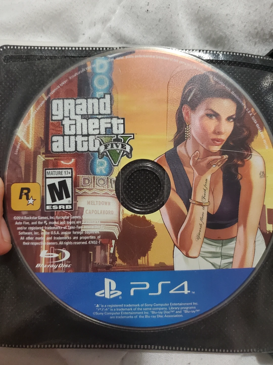 No case due to the fact I put all my games in a binder Grand Theft Auto V for PlayStation 4. This is the Blu-ray disc version of the game. It's rated Mature 17+ by ESRB.