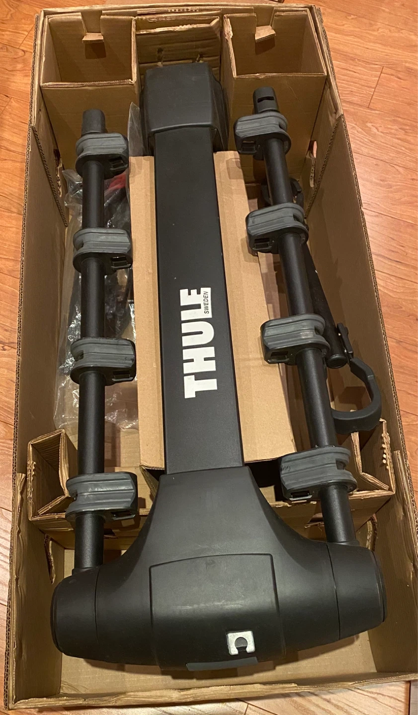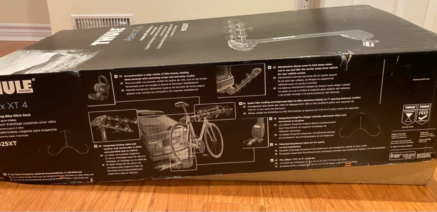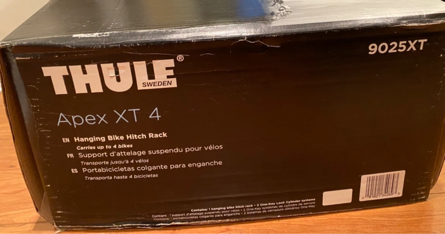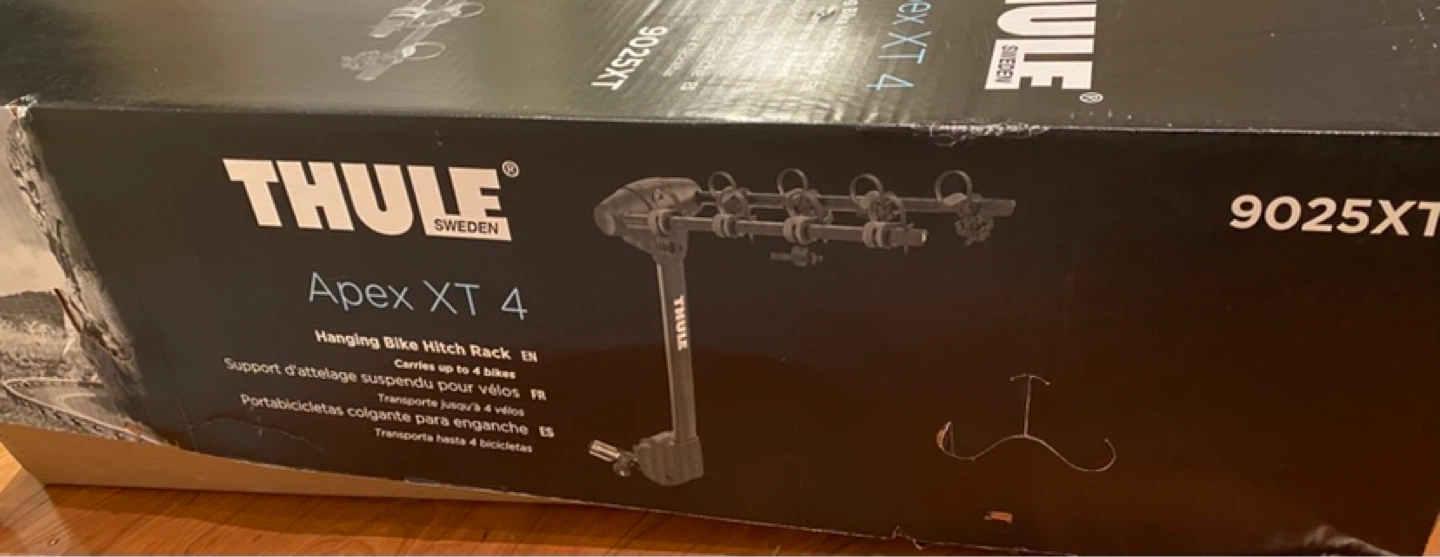 This is a practically new Thule Apex XT 4 bicycle bike rack (9025XT) with the original box. It includes lots of extra straps and a roll of a tightening strap (which was never used). Also included is an adapter bar for smaller bikes. This is the best 4 bike hitch around. Super reliable and sturdy (even on highways). Brand new this is being sold for $600+tax (~$678).