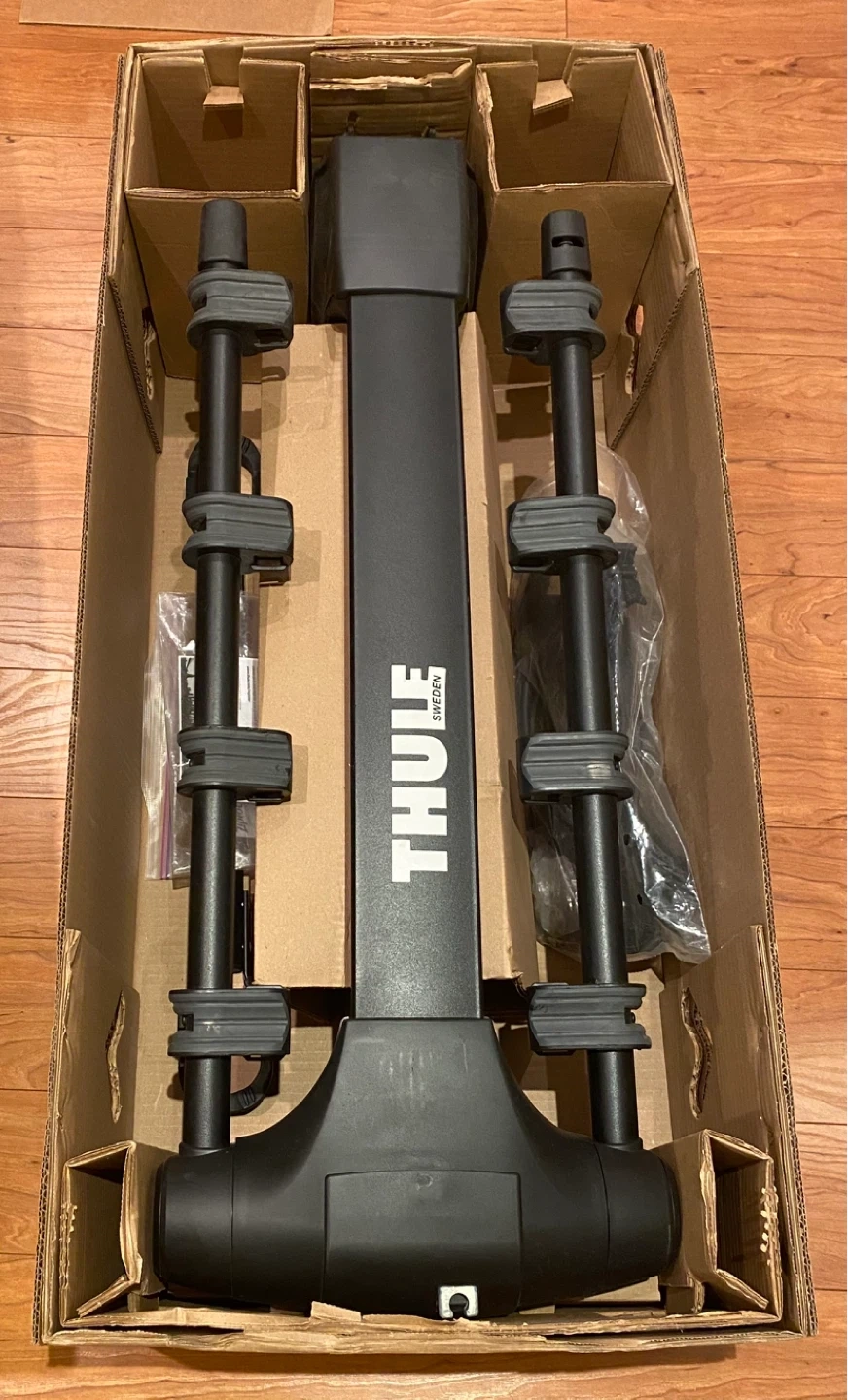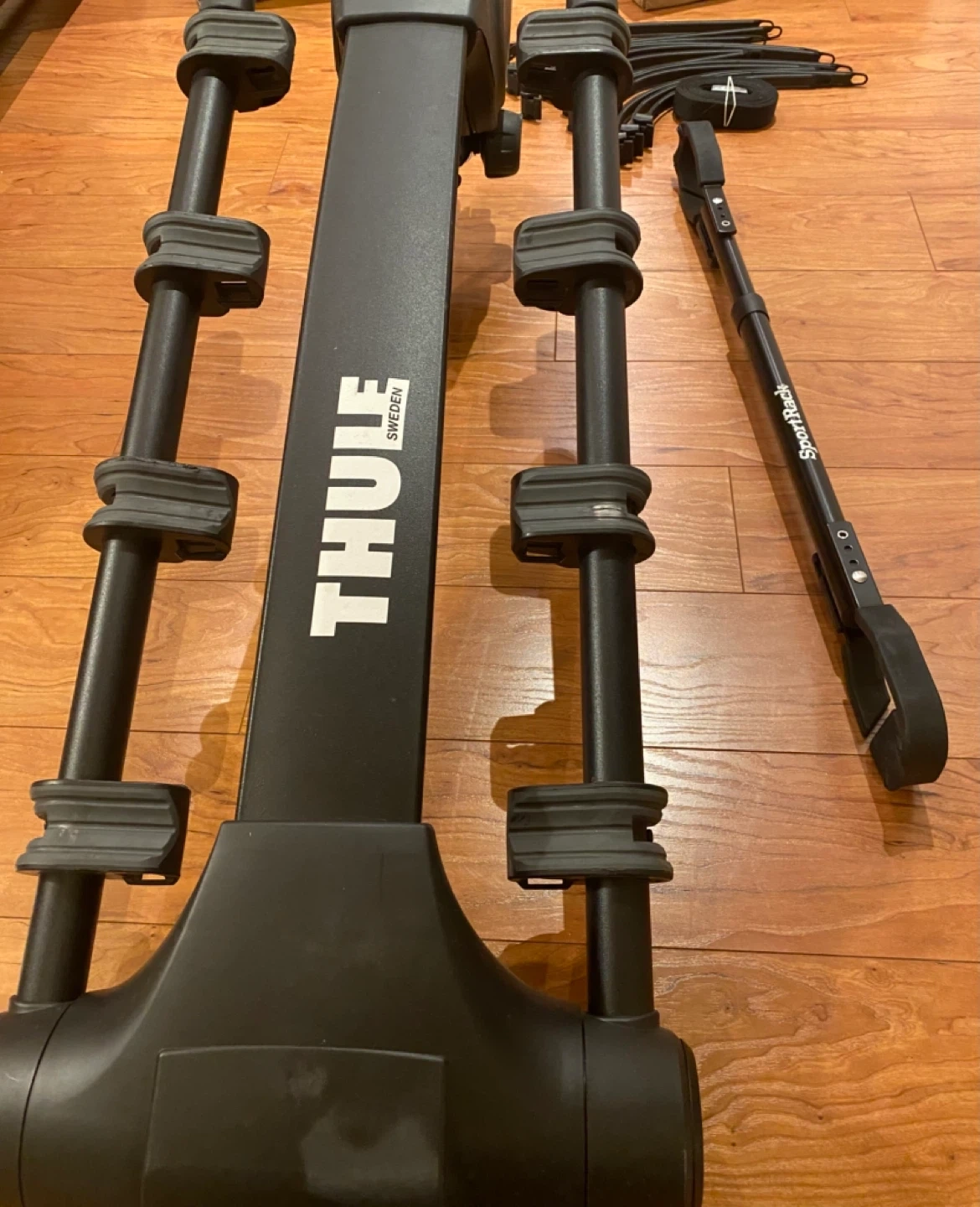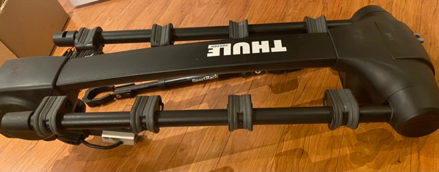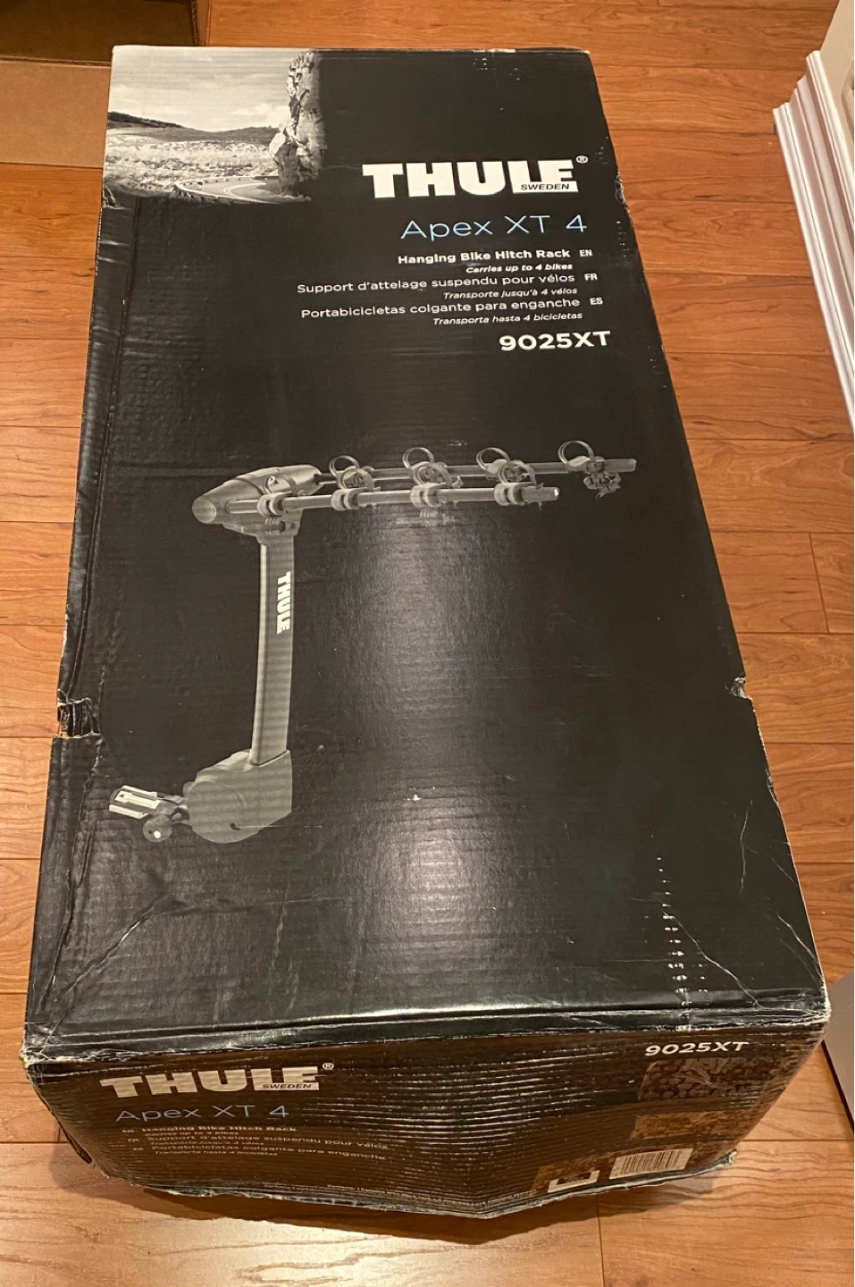 This is a practically new Thule Apex XT 4 bicycle bike rack (9025XT) with the original box. It includes lots of extra straps and a roll of a tightening strap (which was never used). Also included is an adapter bar for smaller bikes. This is the best 4 bike hitch around. Super reliable and sturdy (even on highways). Brand new this is being sold for $600+tax (~$678).