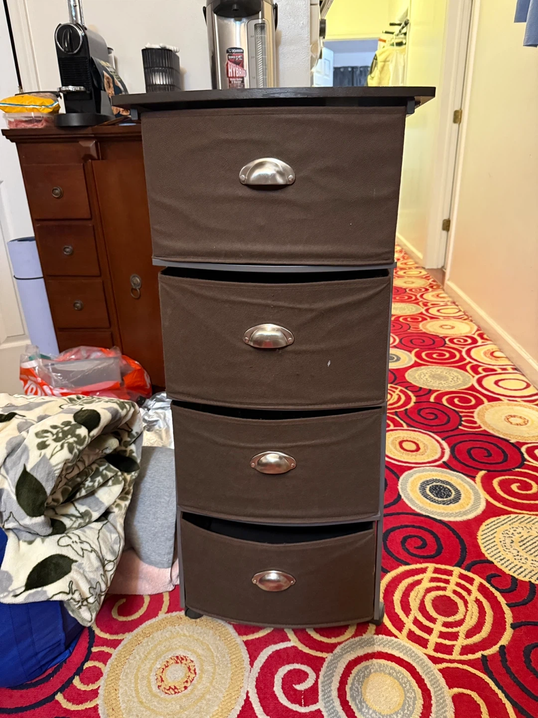 This fabric storage organizer has a dark brown finish and four drawers. Each drawer features a metal pull handle. It's great for storing clothes, linens, or other household items. Some assembly may be required.