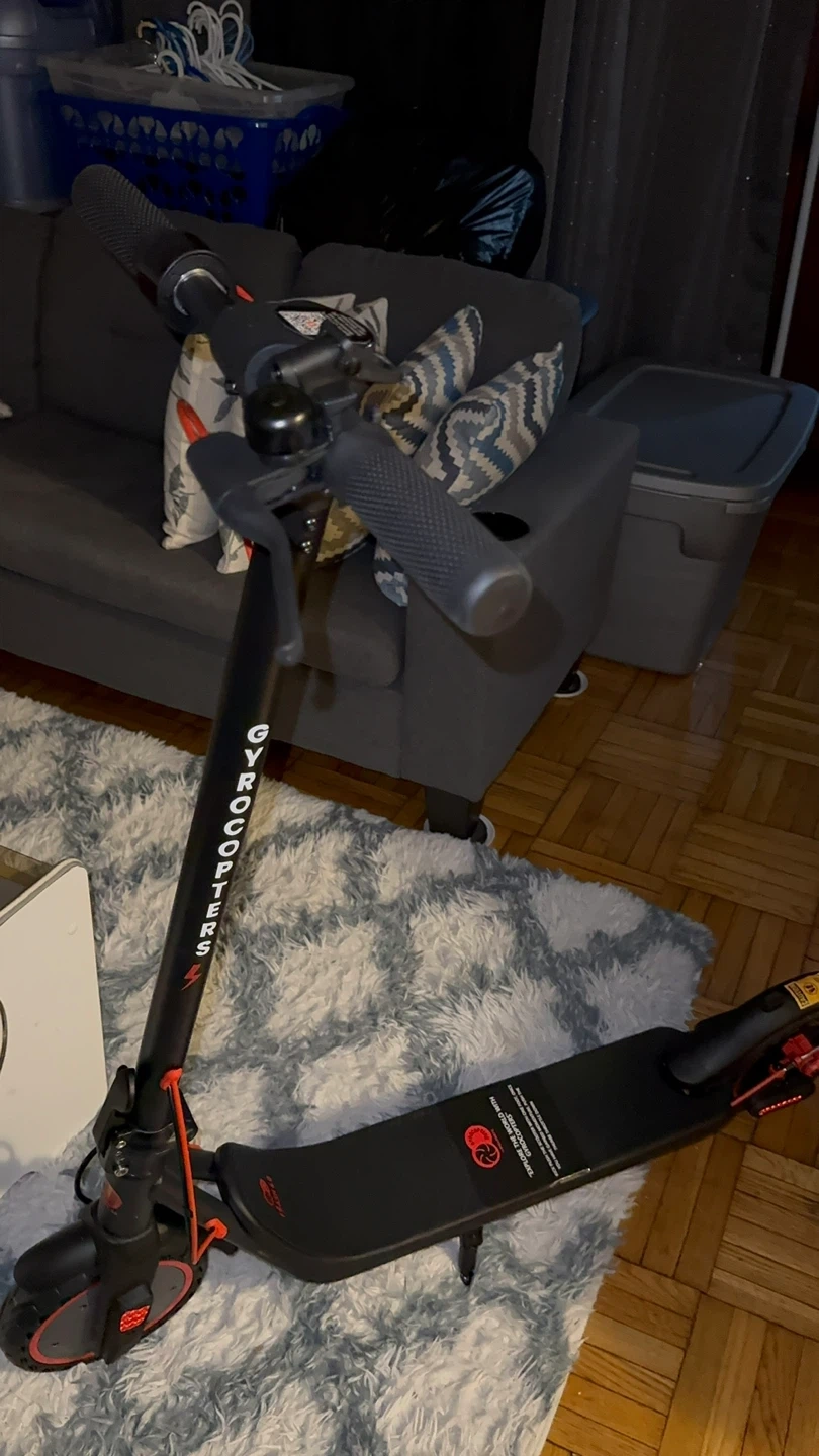 GYROCOPTERS electric scooter in black. It's a fun way to get around town. This scooter's deck is wide, providing stability. It has a foldable design for easier storage and transport. Great for commutes or just cruising!