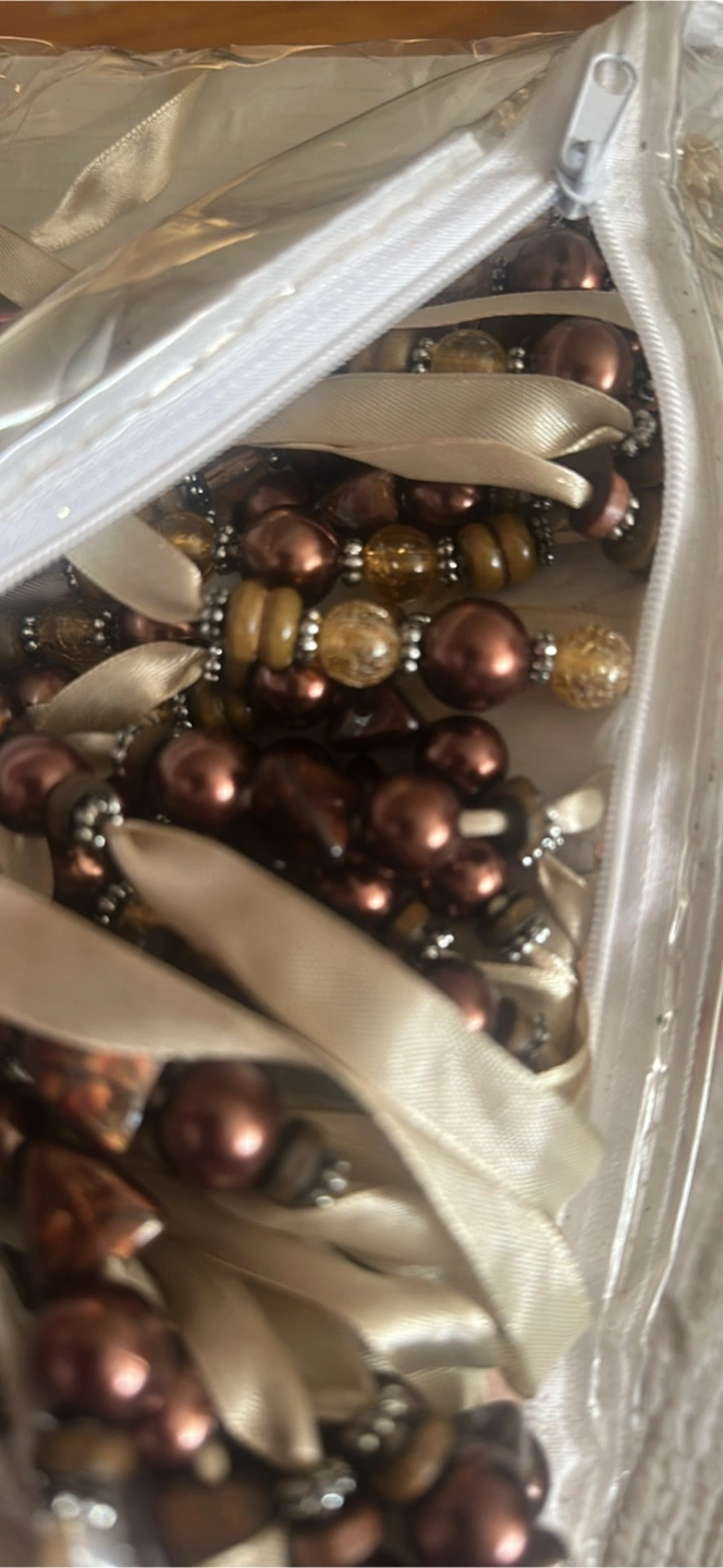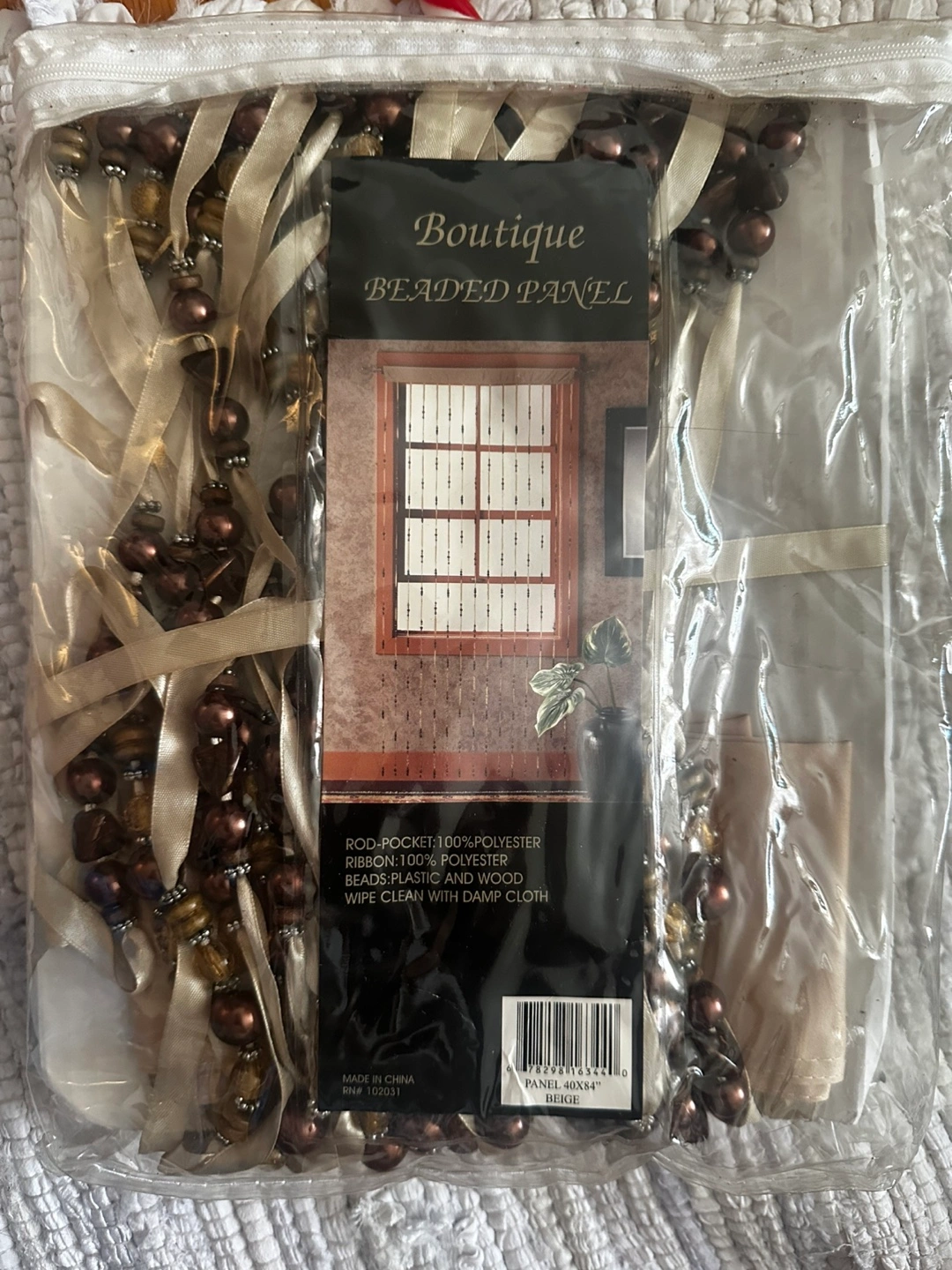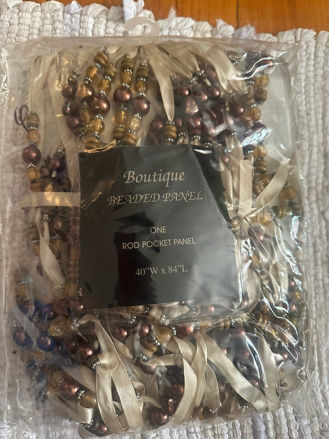 Selling a Boutique Beaded Panel still in its original packaging! It's a beautiful beige color with beads made of plastic and wood. The rod pocket is 100% polyester, and the ribbon is also 100% polyester. It measures 40" wide by 84" long! Easy to clean with a damp cloth,pick up only serious buyers ,Cash