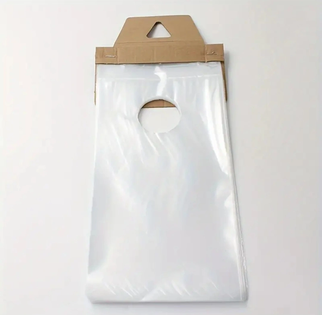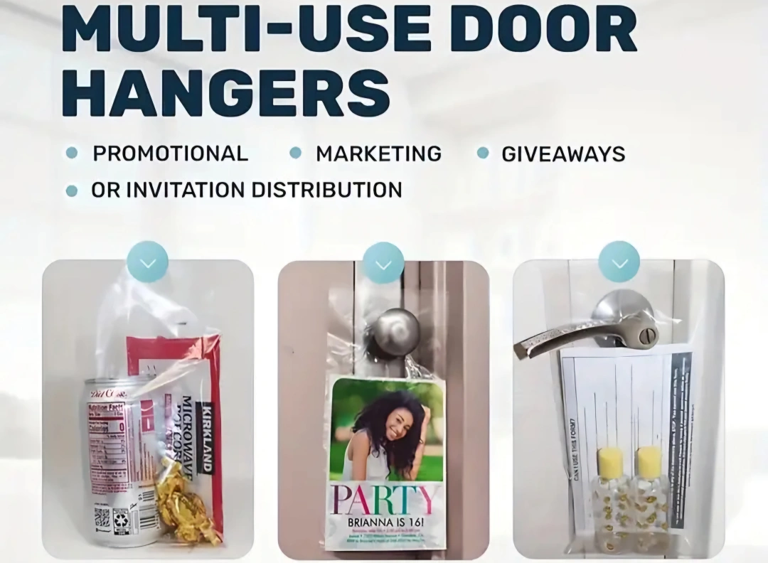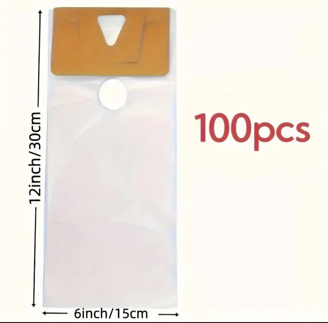 200 clear plastic bags. Each bag features a cardboard header for hanging on doors. Ideal for promotional materials, marketing, giveaways, or invitation distribution. Measures 12 inch/30cm tall and 6 inch/15cm wide.