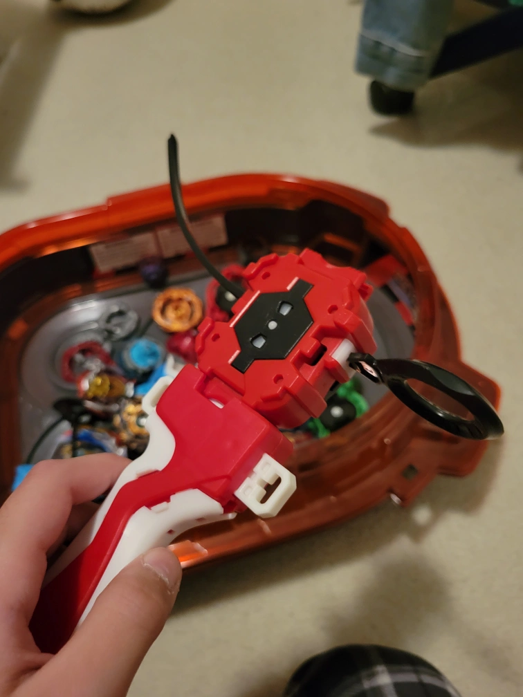 Red and white Beyblade Burst launcher. Includes a red Beyblade Burst stadium. Many Beyblades included. Great for playing Beyblade Burst.