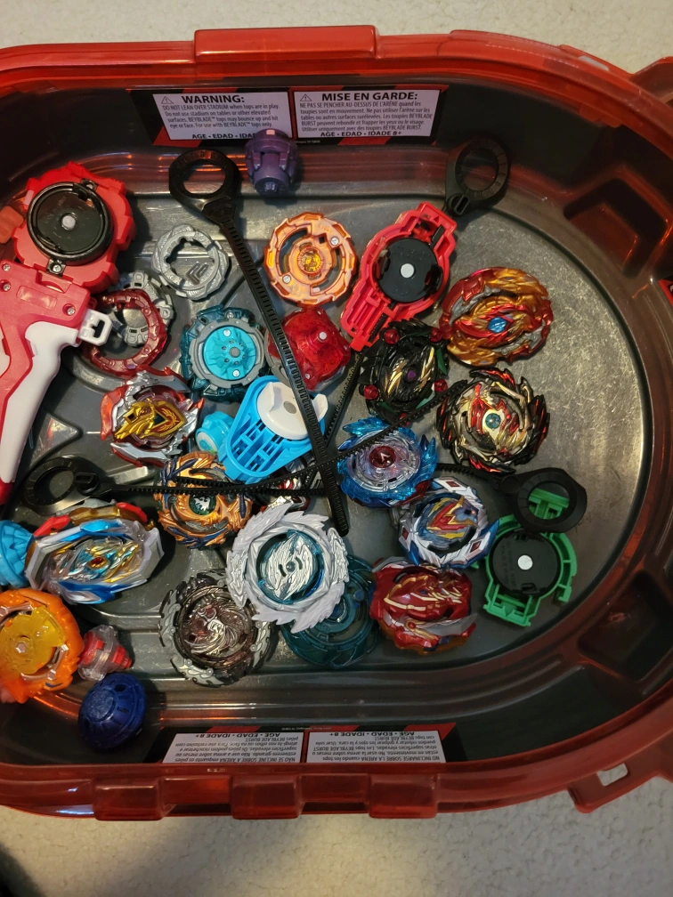 Red and white Beyblade Burst launcher. Includes a red Beyblade Burst stadium. Many Beyblades included. Great for playing Beyblade Burst.