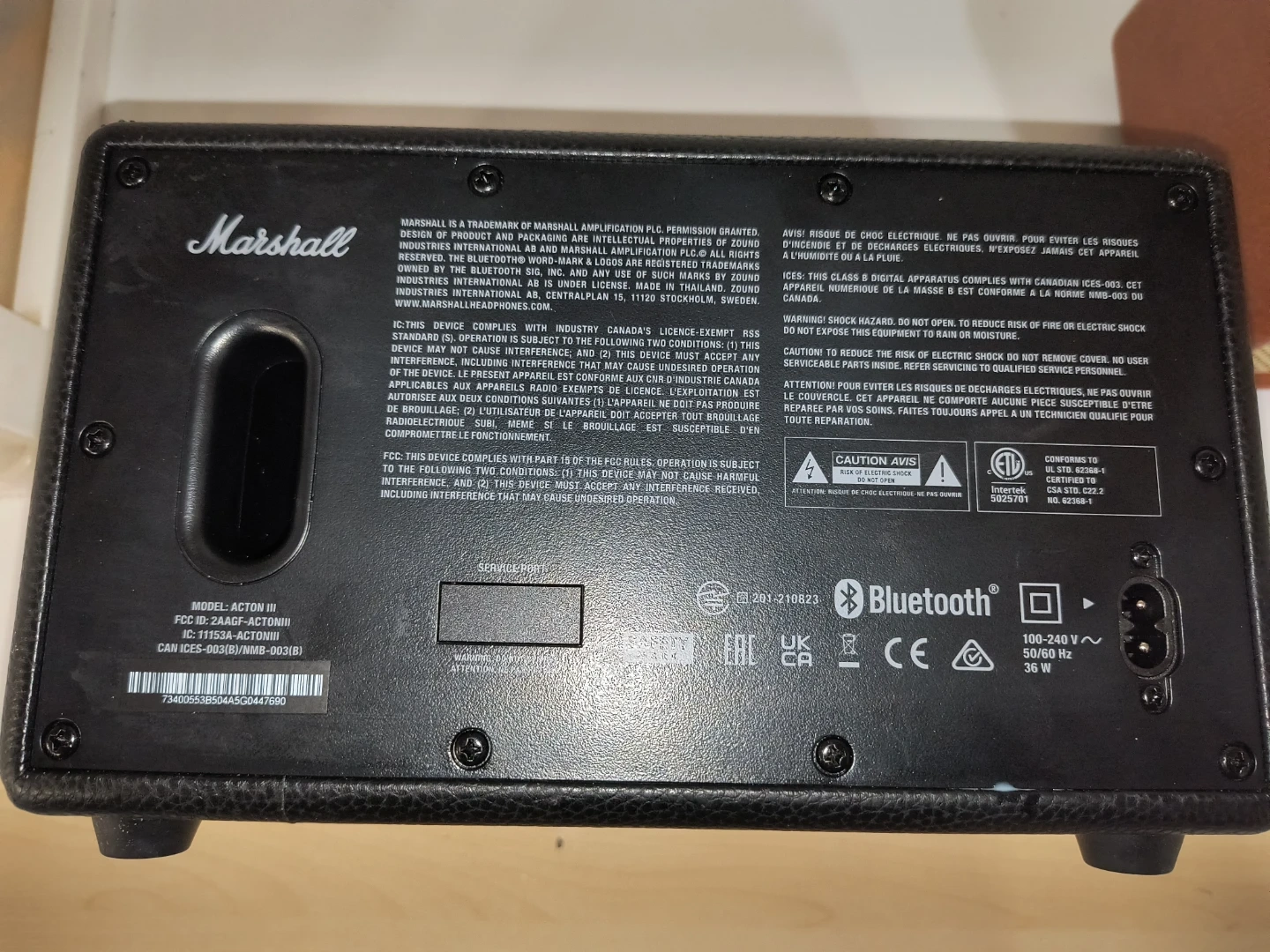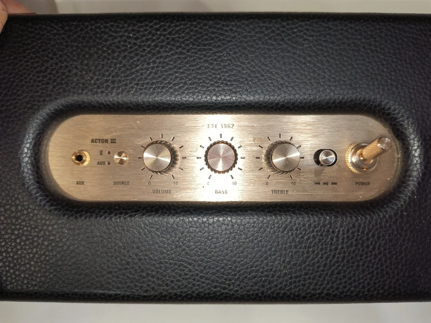 This Marshall Acton III speaker is black with a faux leather finish. It features volume, bass, and treble controls. Connect your devices via Bluetooth or AUX.