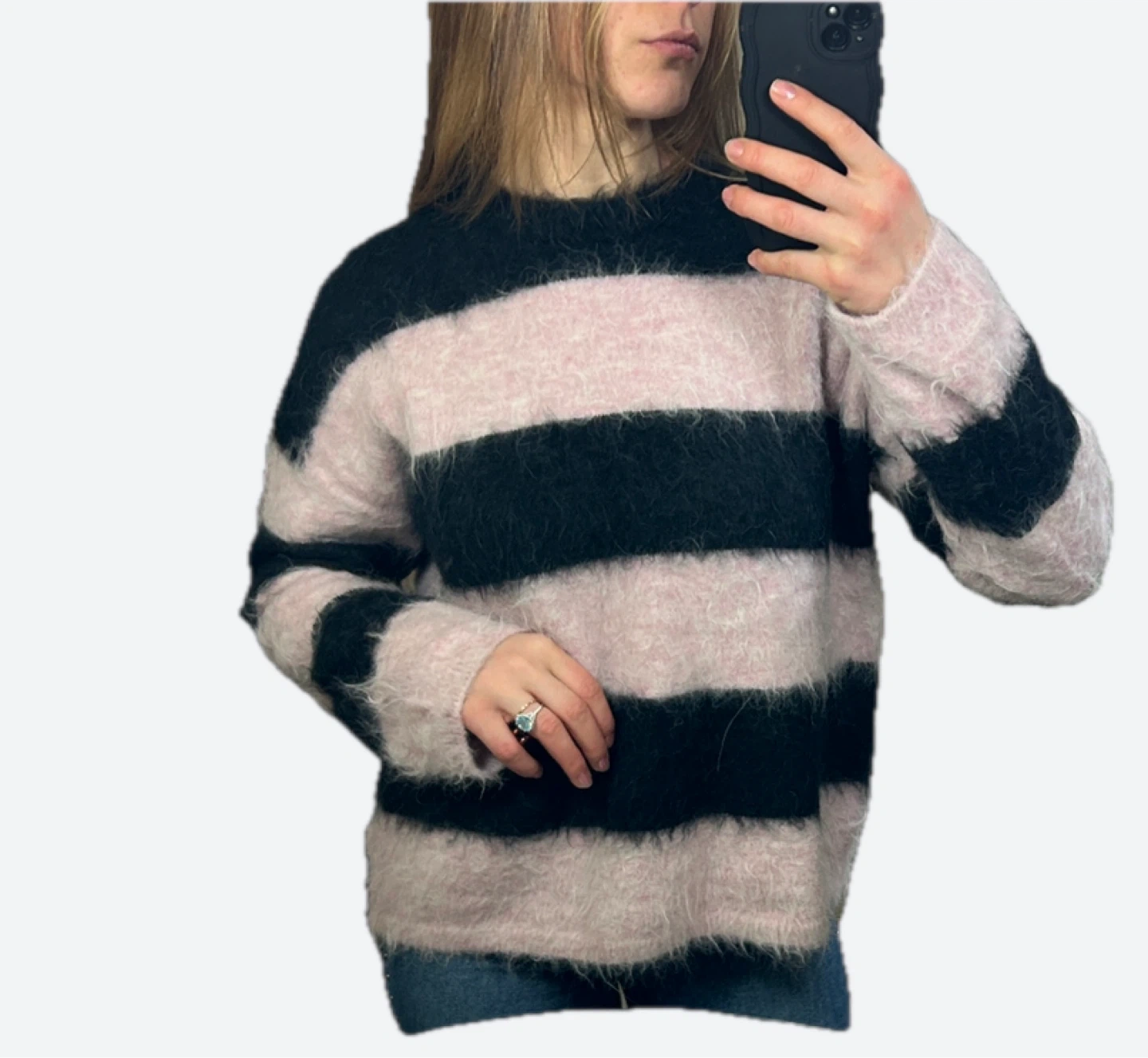 Cozy pink and black striped fuzzy sweater. It's made with a soft, brushed material for extra warmth. This sweater's got a relaxed fit. Wool and super warm!