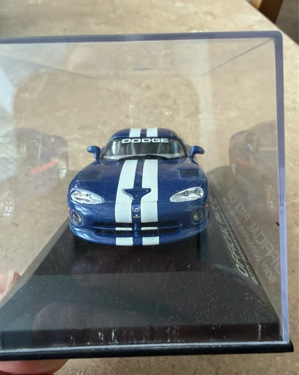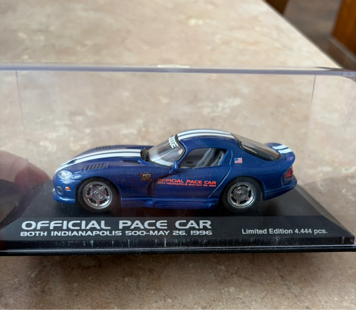 This is a 1996 Dodge Viper GTS Official Pace Car diecast model. It's a limited edition of 4,444 pieces commemorating the 80th Indianapolis 500 on May 26, 1996. The model is blue with white racing stripes.