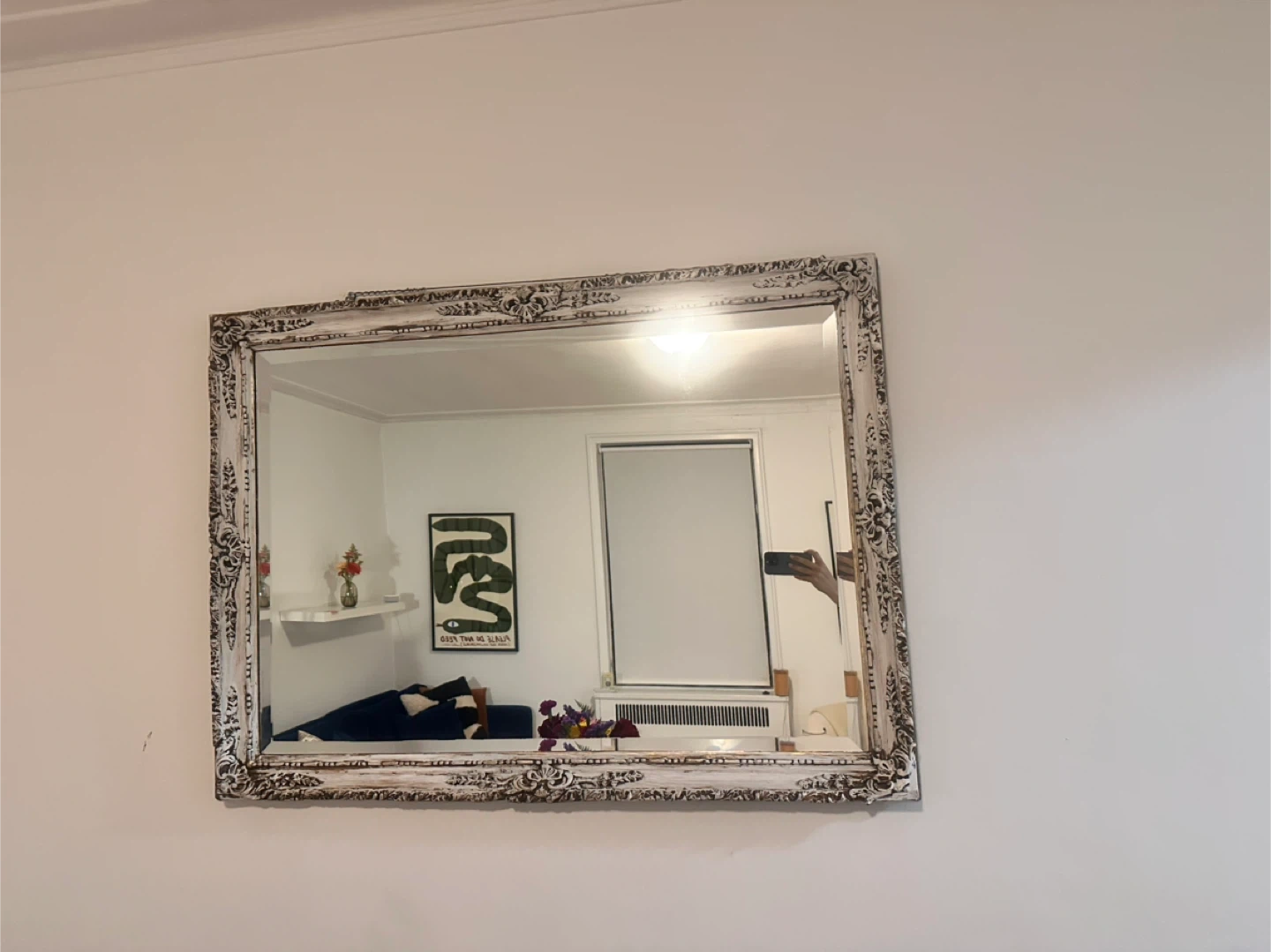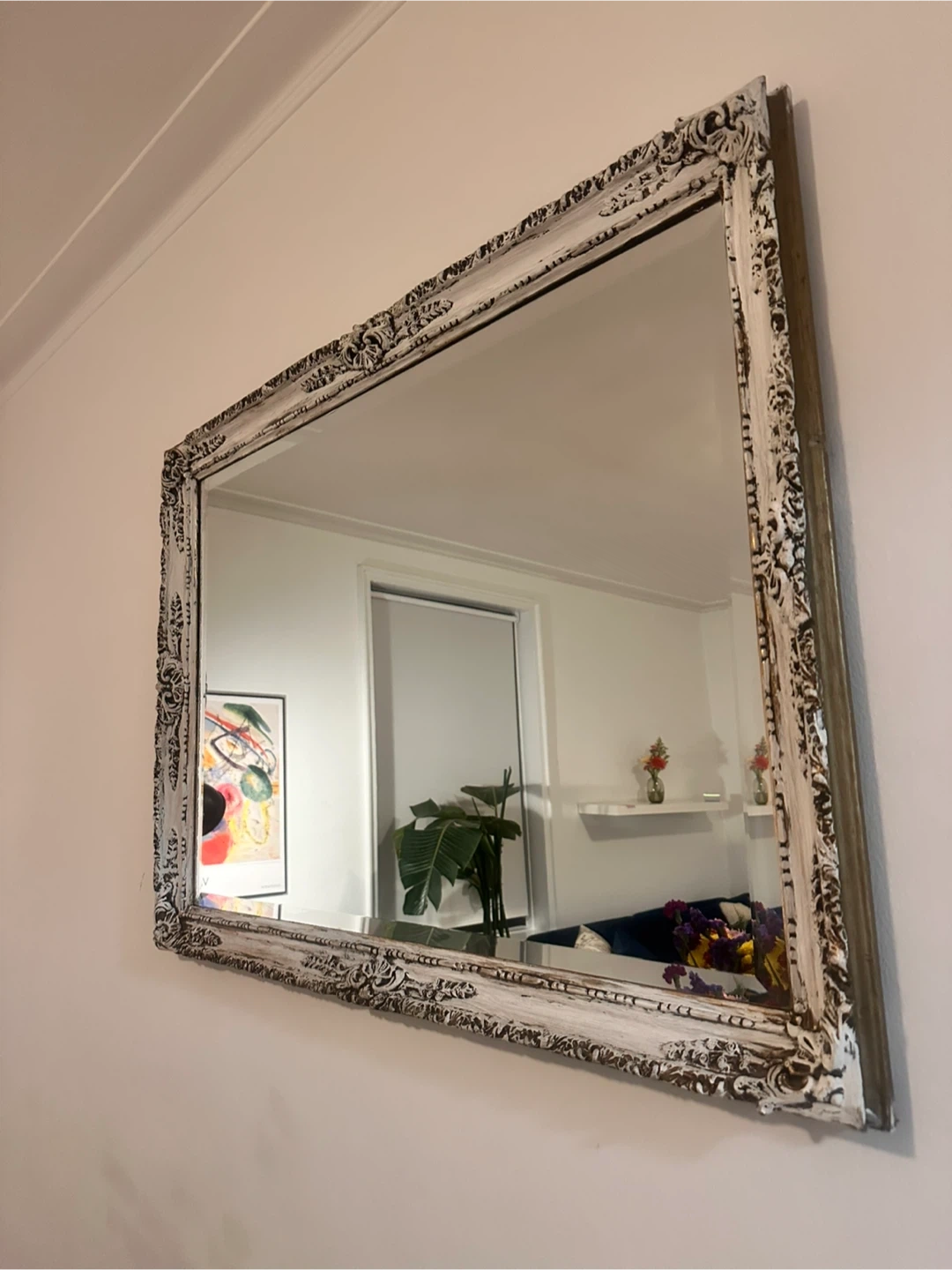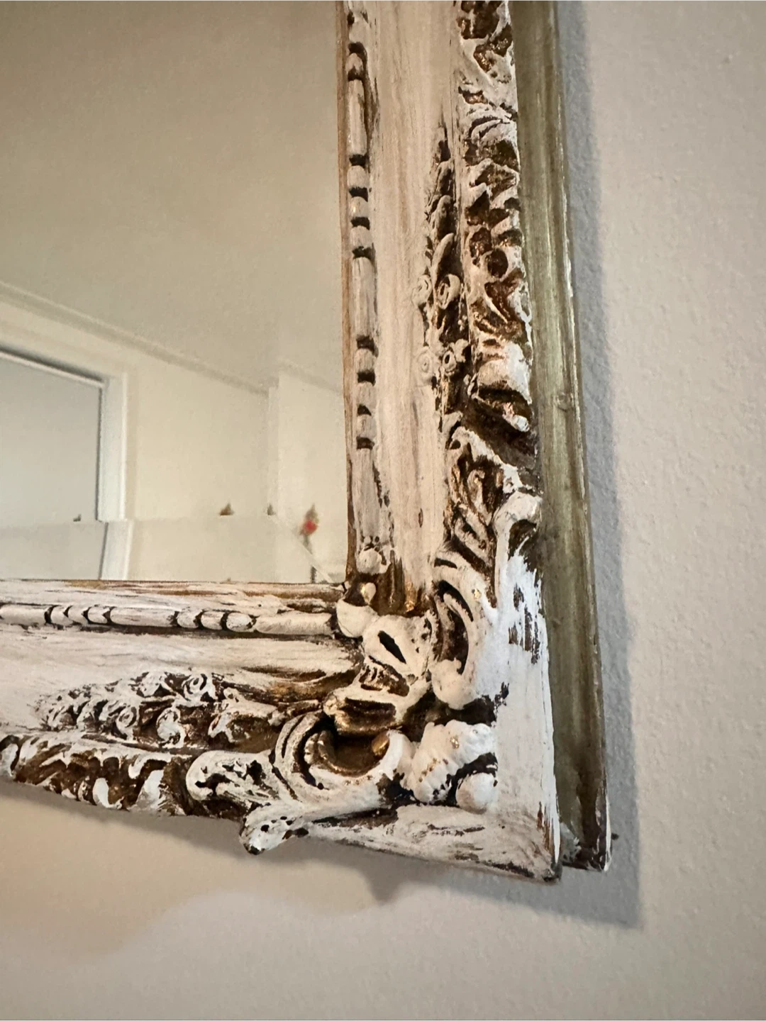 Beautiful vintage French provincial style wall mirror featuring an elegant ornate carved wood frame with distressed white patina over bronze finish.
