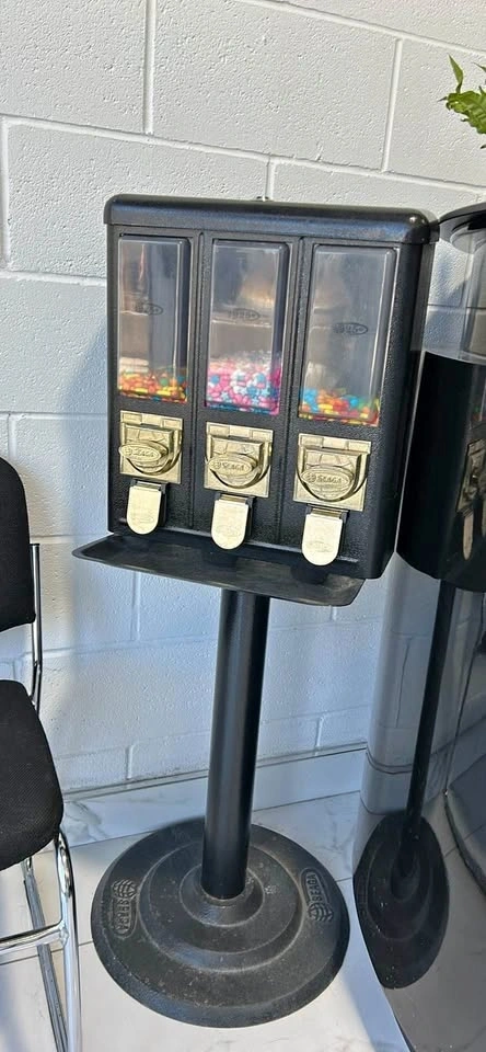 Sturdy Seaga triple head candy machine in black metal with gold-tone coin mechanisms. Features three clear plastic canisters for different snacks and sits on a heavy-duty pedestal base. Top lock is present for security.