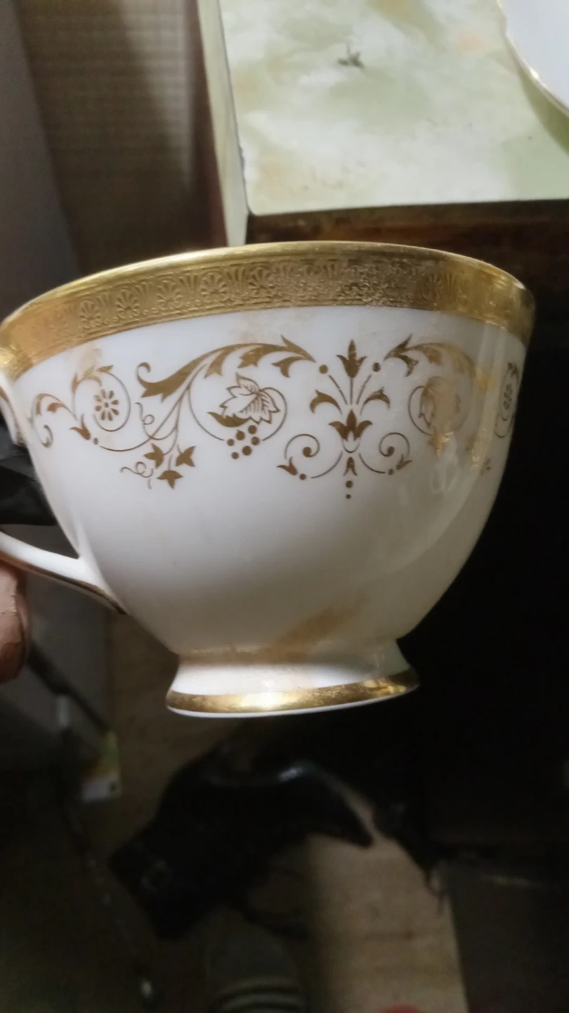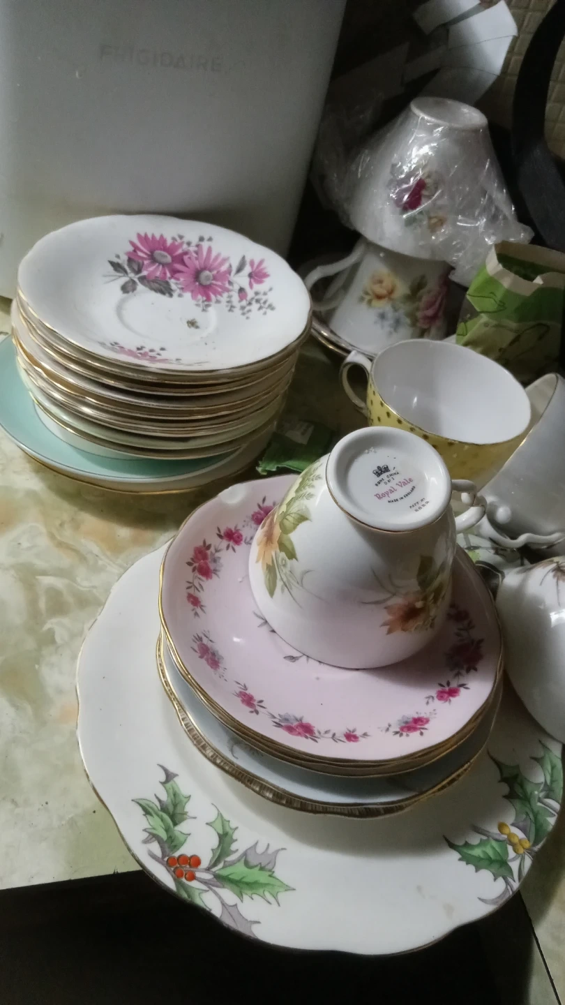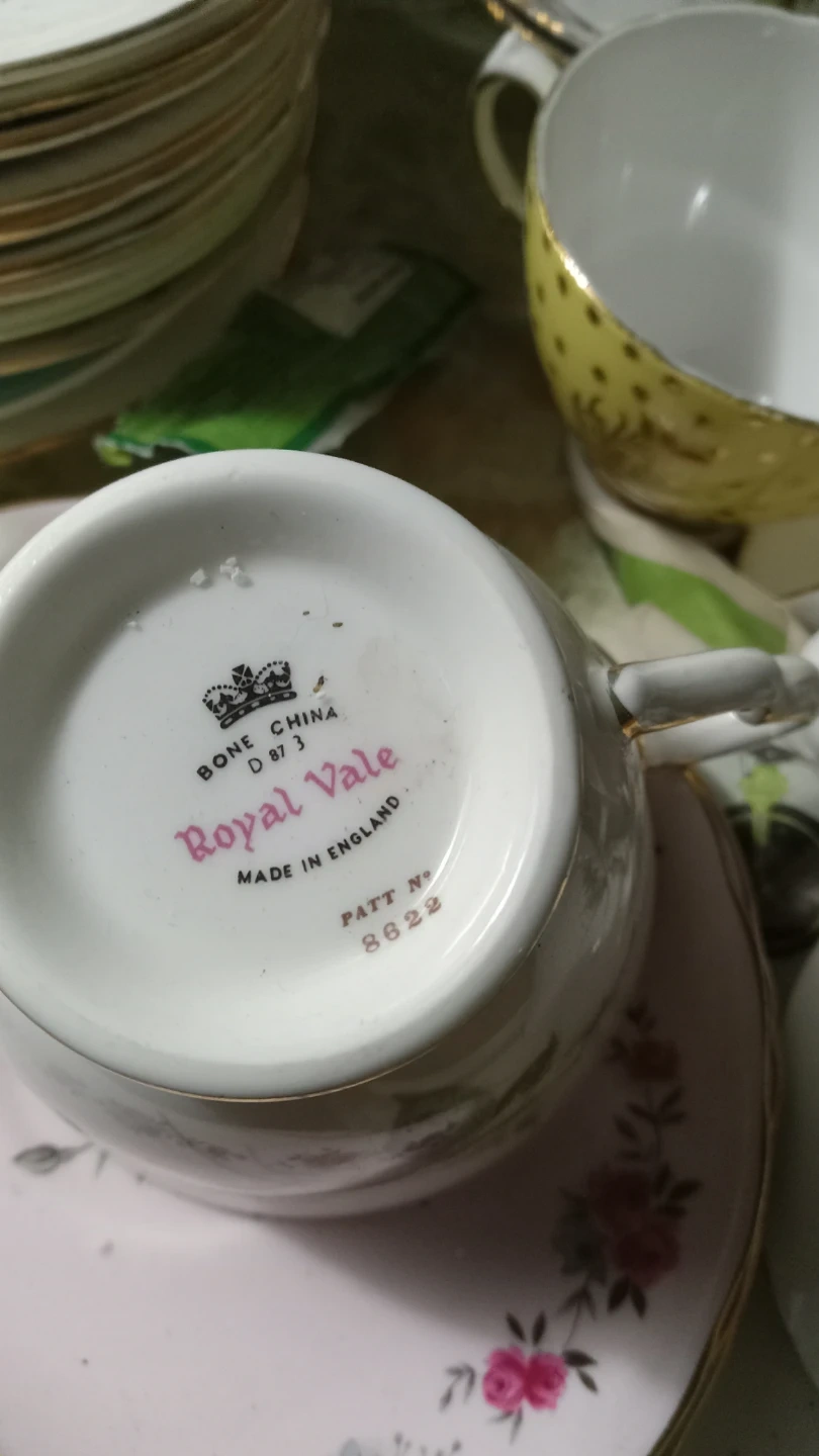 Beautiful white bone china teacup and saucer set with gold trim and floral designs. Made in England by Royal Vale. It's perfect for enjoying a nice cup of tea! Have an extensive collection rare king, Albert sets some China as old as 1700s. Grandparents passed away and just wanna Get it out there to someone who loves this stuff like they did.\nMake a reasonable offer.You're welcome to come see