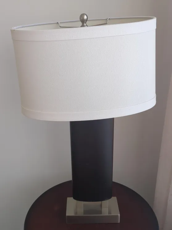 Selling a stylish table lamp with a black base and a white shade. It's in great condition and would look lovely in any room!