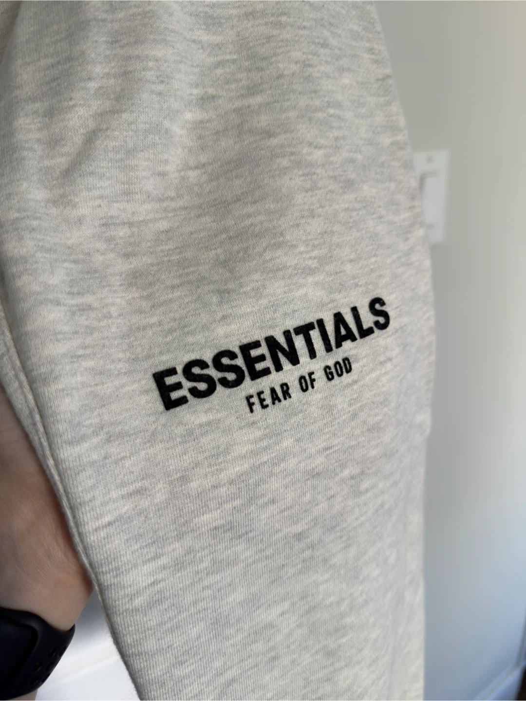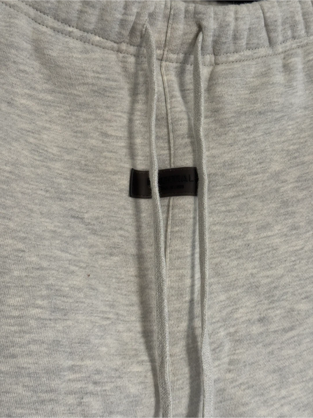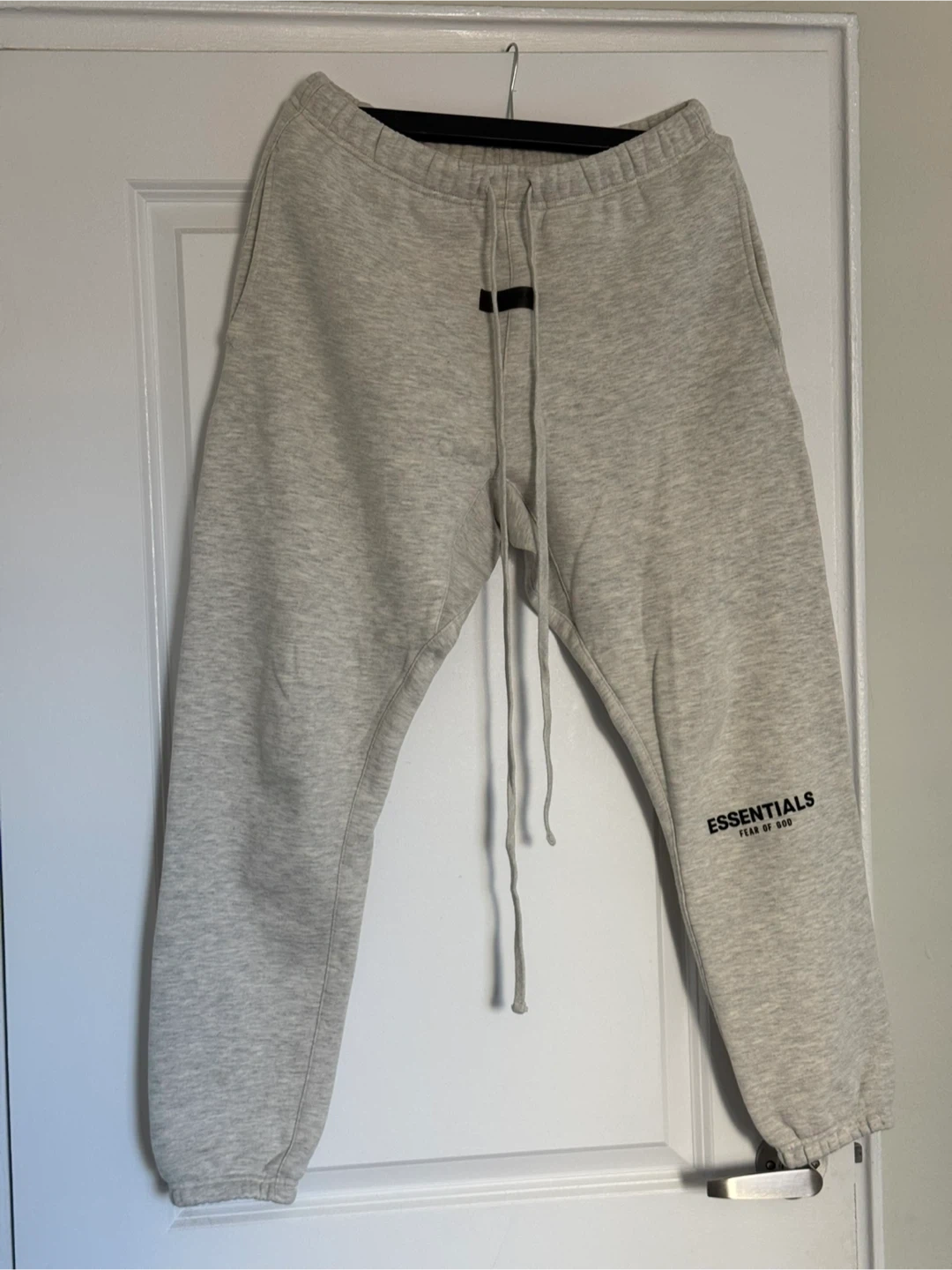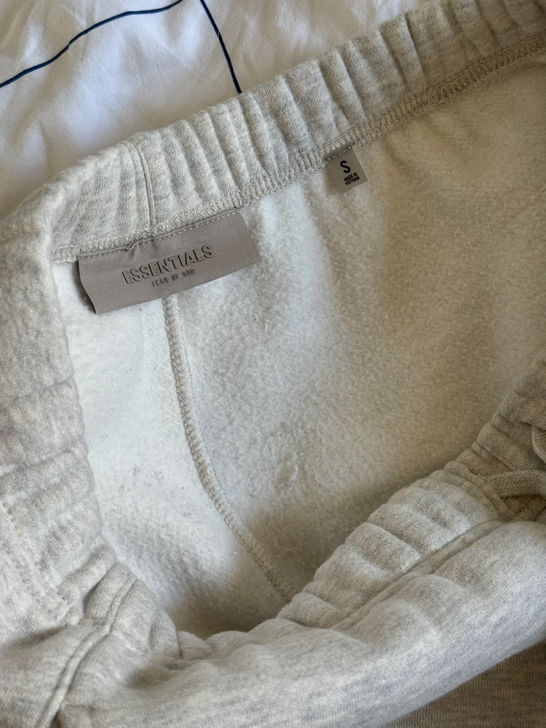 Selling a pair of Essentials Fear of God sweatpants in size small. They're a light grey colour and made of a comfortable material. Great for lounging or casual wear!