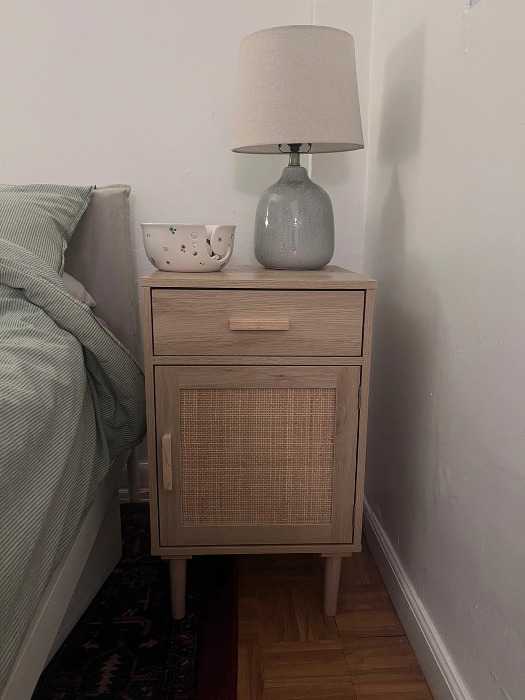 Selling 2 x cute wood nightstands! Features a rattan door and a drawer. The dimensions are approximately 15.75" x 15.75" x 27". It's perfect for adding a touch of natural texture to your bedroom decor.