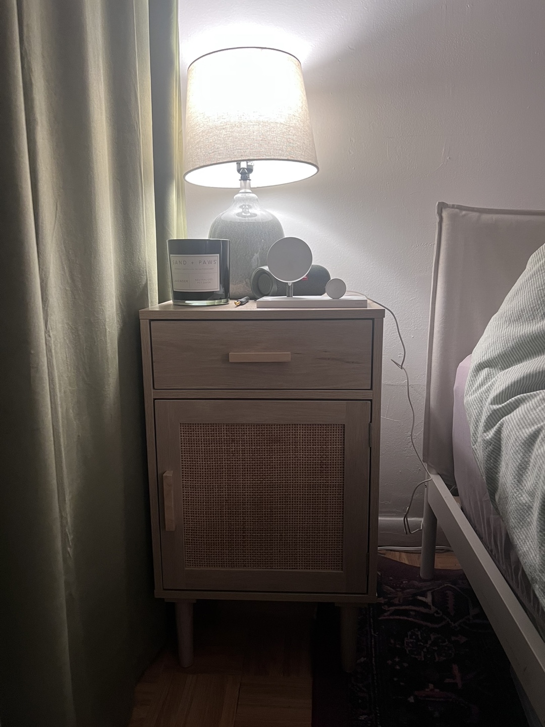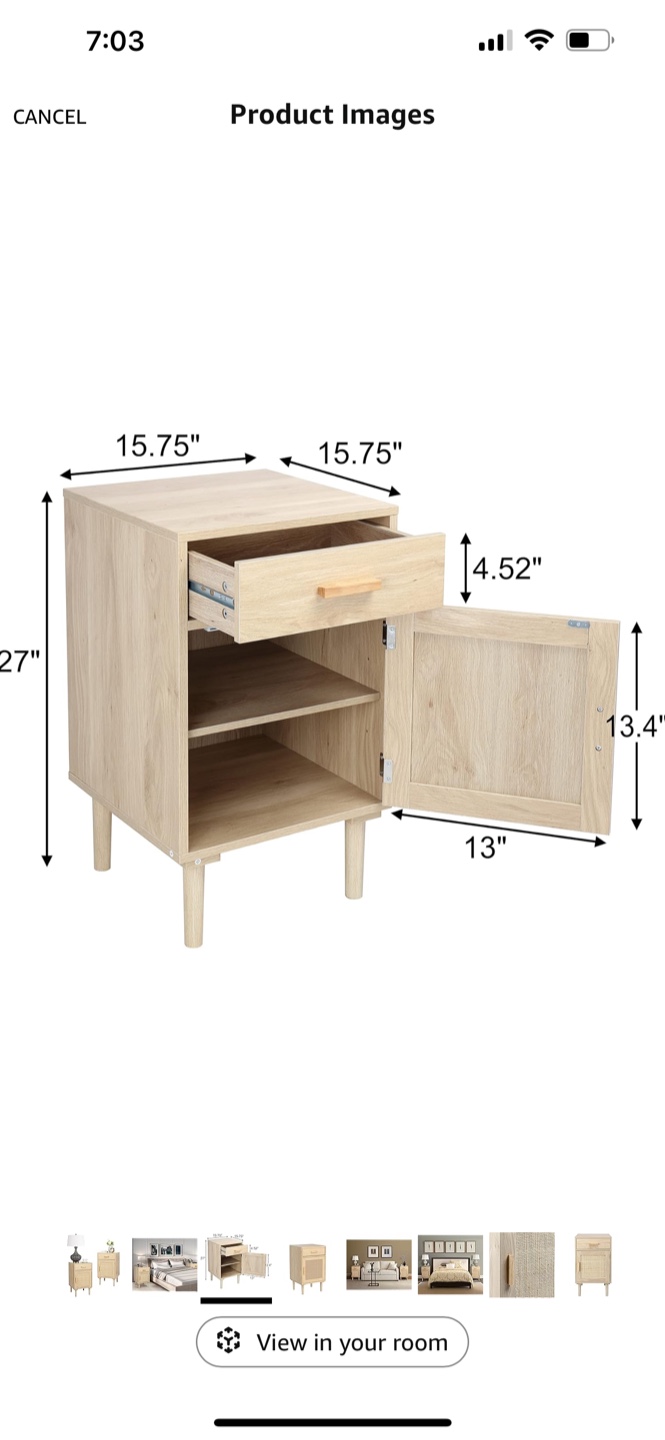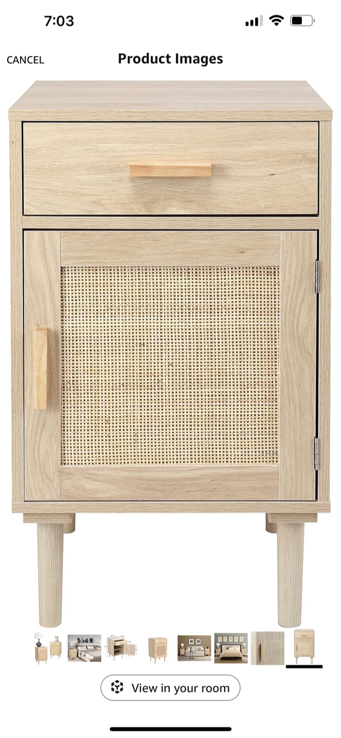 Selling 2 x cute wood nightstands! Features a rattan door and a drawer. The dimensions are approximately 15.75" x 15.75" x 27". It's perfect for adding a touch of natural texture to your bedroom decor.