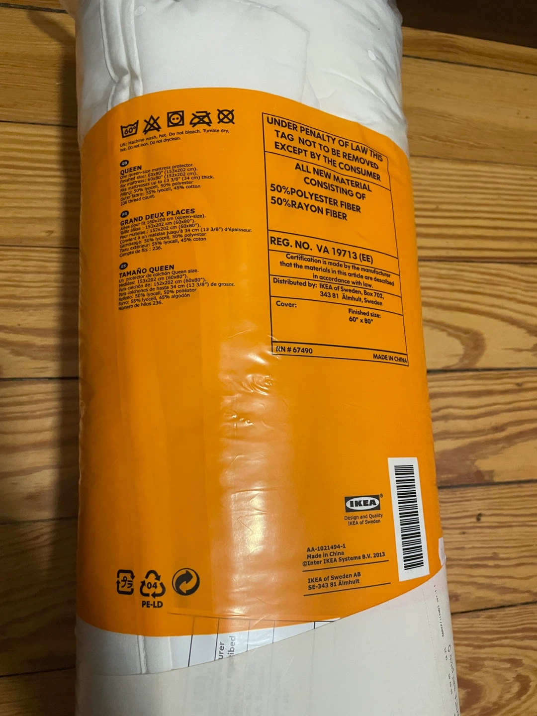 This IKEA Kungsmynta comforter is Queen size. It's made from 50% polyester fiber and 50% rayon fiber. It's designed for all-season use.