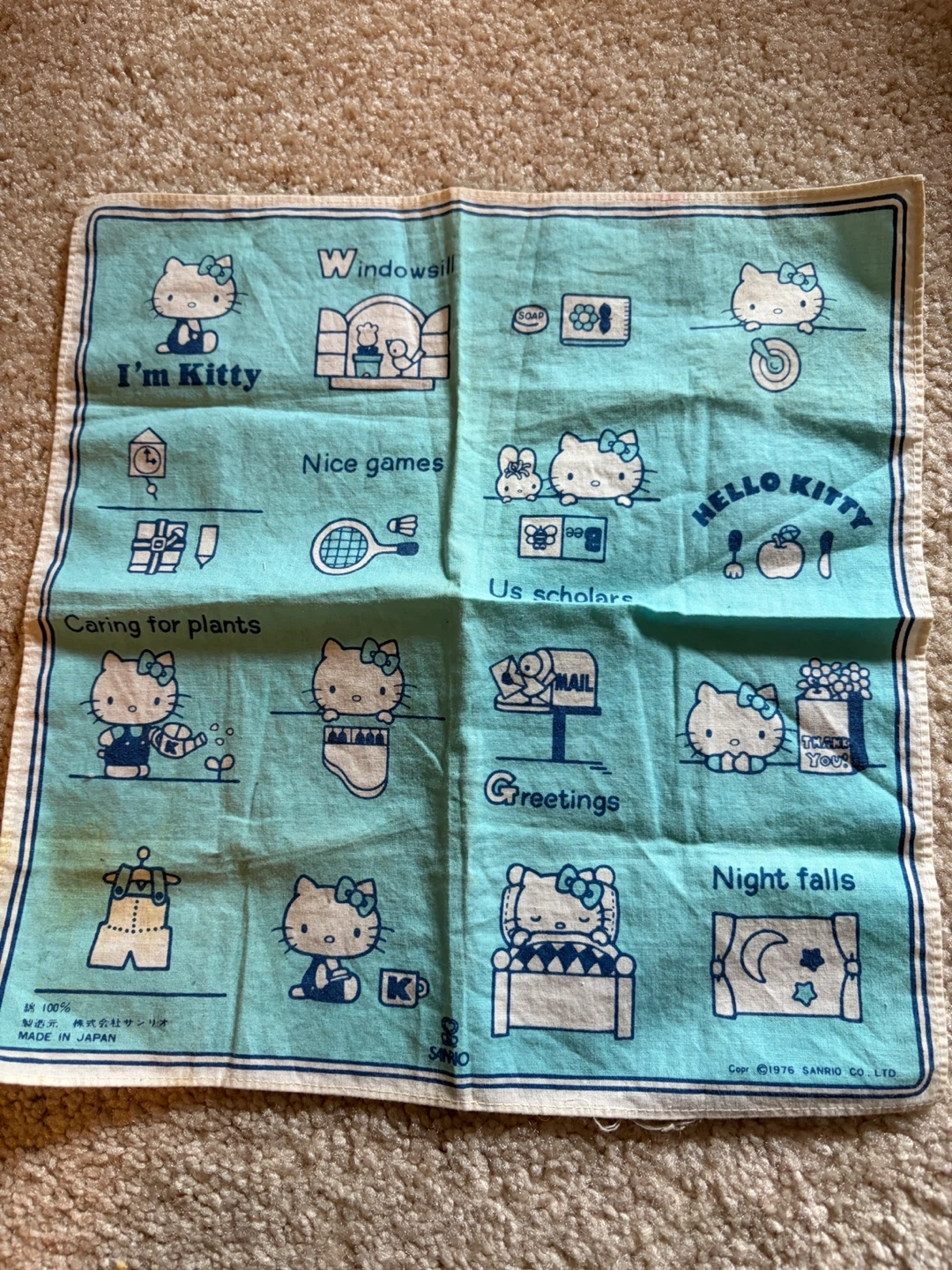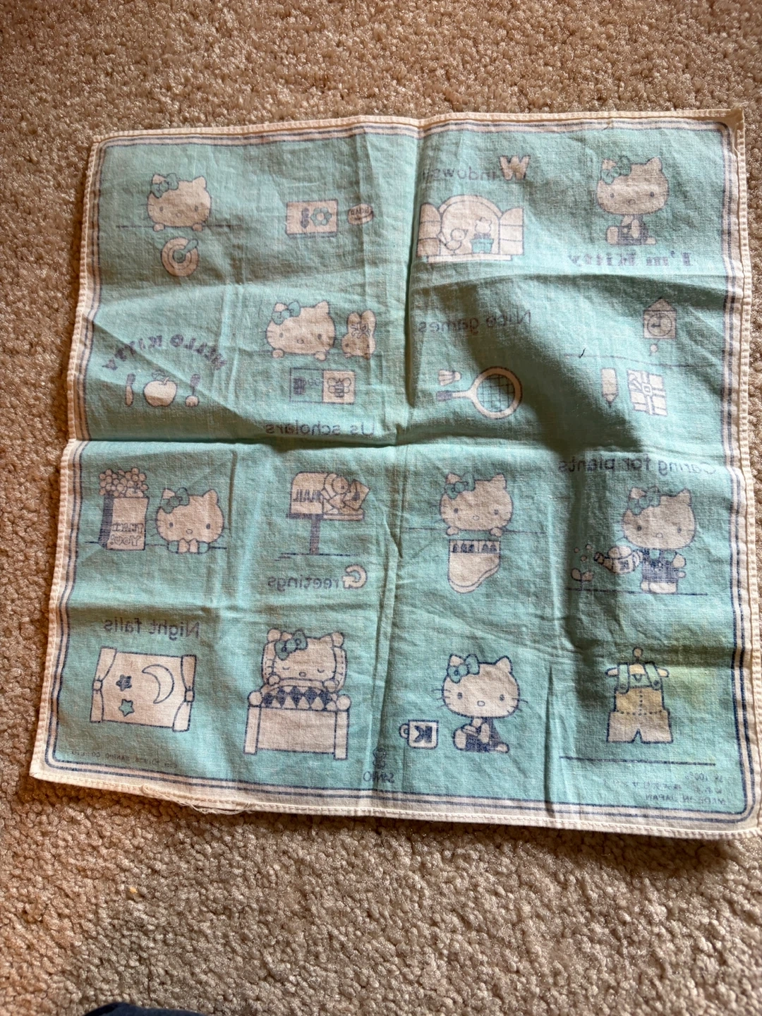Features multiple cute Hello Kitty illustrations with captions like 'I'm Kitty', 'Nice games', and 'Night falls'. The handkerchief is light blue with a white and yellow border. It's made in Japan. Perfect for collectors of vintage Sanrio items!