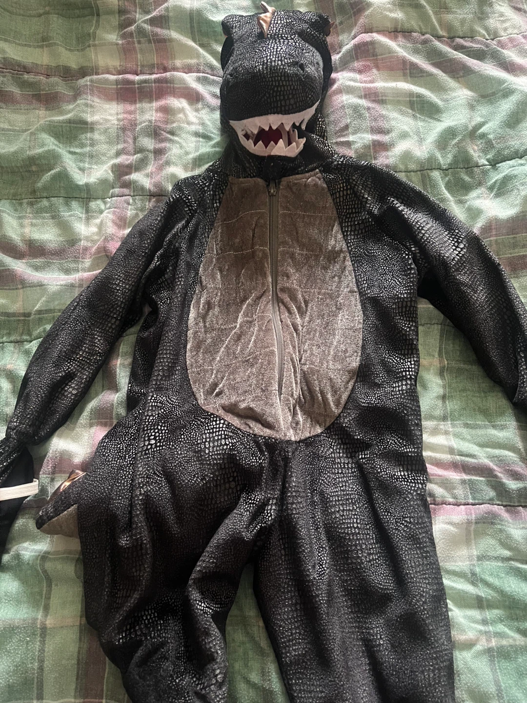 A fun dinosaur costume for kids! It's in great shape and ready for dress-up or Halloween. Includes the full body suit with attached hood, tail, and shoe covers, plus the matching gloves. Roar!