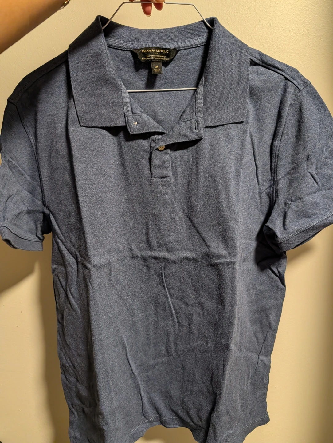 Here's a Banana Republic polo shirt in size medium! It's a nice, casual shirt that's perfect for everyday wear. The colour is a lovely blue-grey, and it's in great condition. A classic addition to any wardrobe!