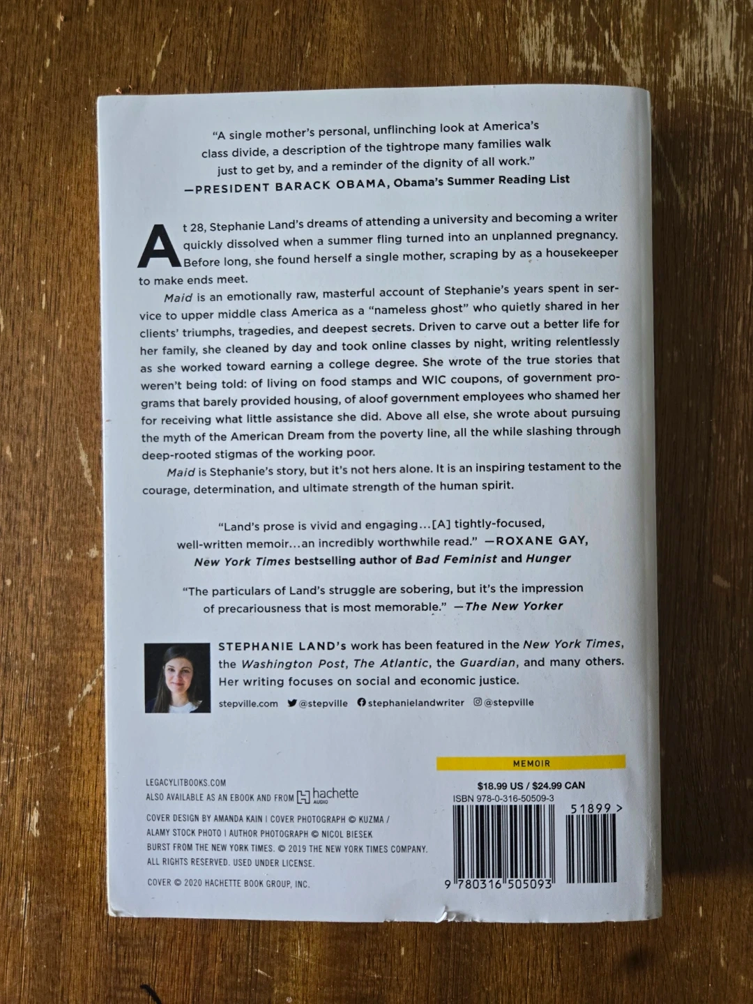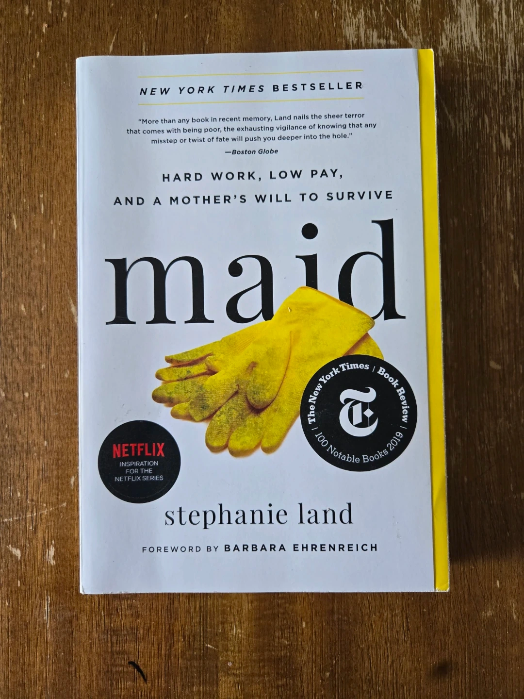 This paperback book is "Maid: Hard Work, Low Pay, and a Mother's Will to Survive" by Stephanie Land. It's a New York Times Bestseller and inspiration for the Netflix series. The book is about the author's experiences as a single mother working as a housekeeper.
