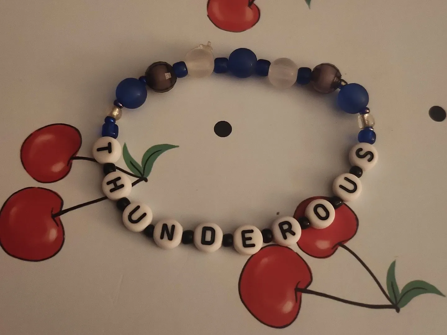 Handmade beaded bracelet spelling out "THUNDEROUS" for the song by KPOP group STRAY KIDS. It's made with assorted blue, grey, and clear beads. Fun accessory for fans of the group.