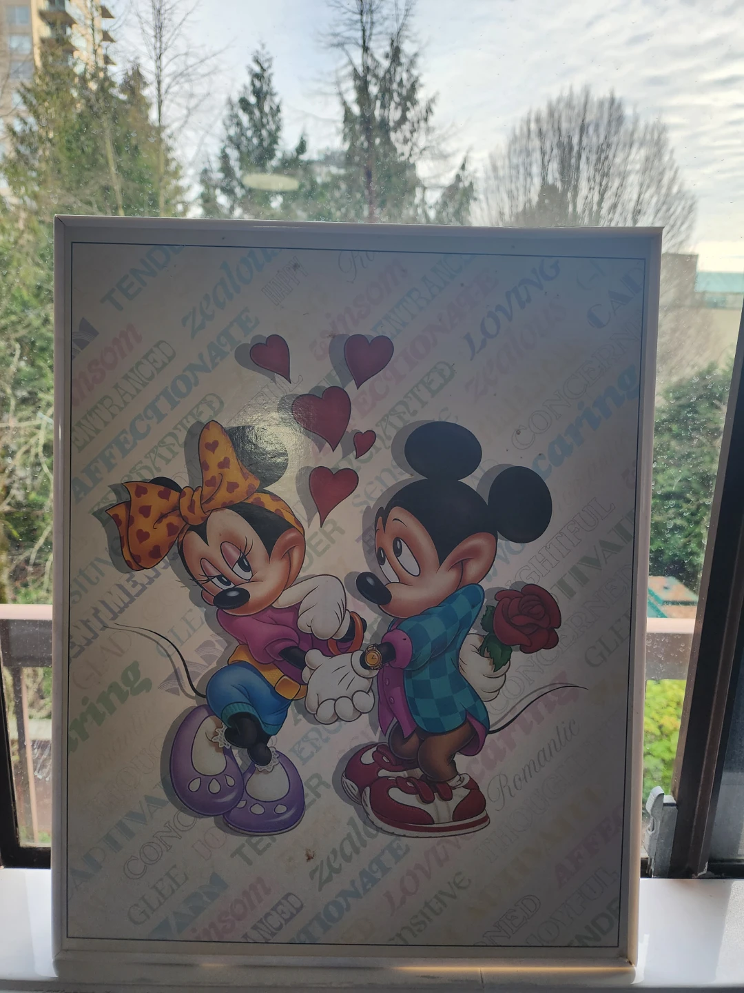 This is a Disney box featuring Mickey and Minnie Mouse in a romantic pose. The background has words like 'loving' and 'affectionate' printed on it. It's a charming piece for any Disney fan!