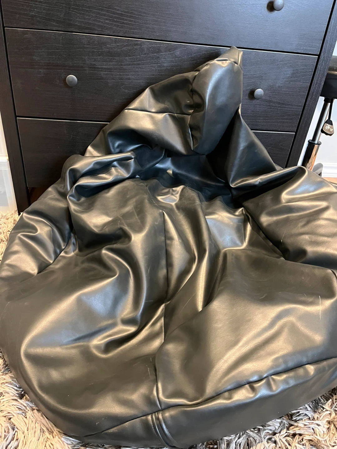Large black faux leather bean bag chair. It's comfy and durable. Great for a den or rec room! 5$ or free with any other purchase