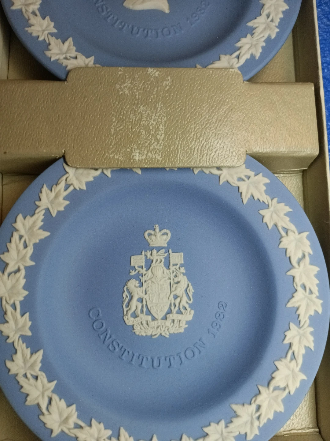 Wedgwood Jasperware compotiers celebrating the Canadian Constitution in 1982. This pair features relief decorations of maple leaves and a central crest and profile. Includes original box and informational booklet.