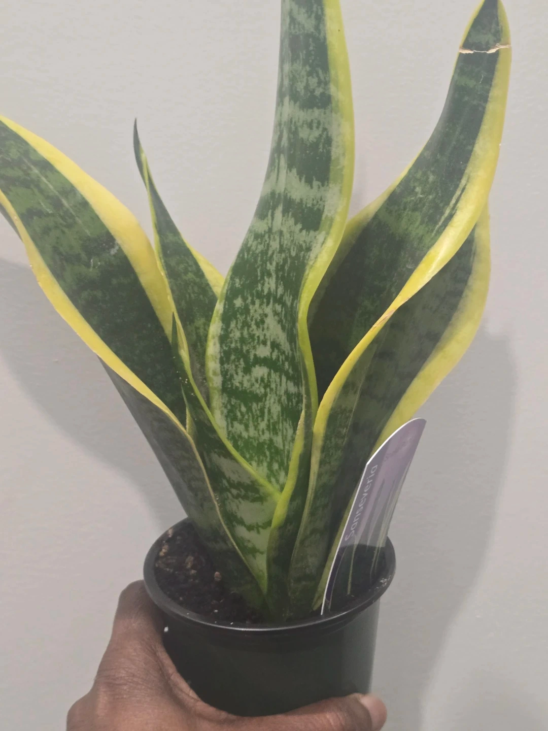 Durable and low-maintenance potted snake plant with variegated green and yellow leaves. It's a compact variety, perfect for small spaces or as a desk plant. These plants are known for their air-purifying qualities!