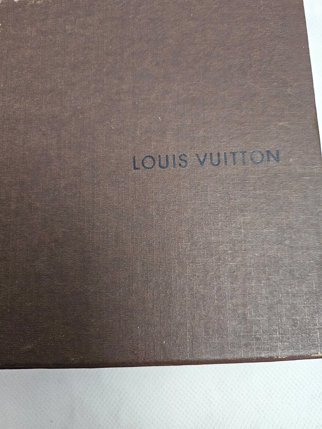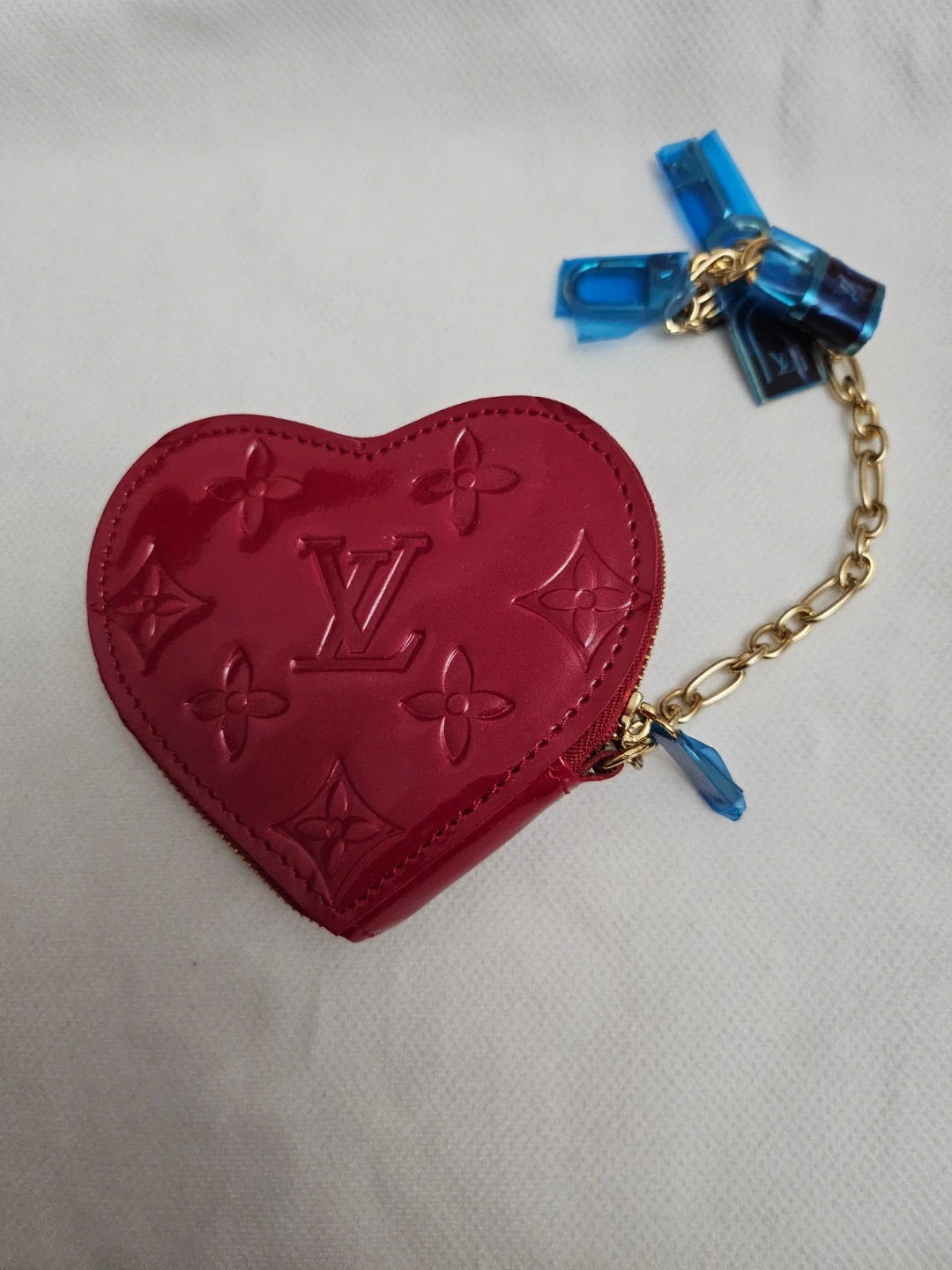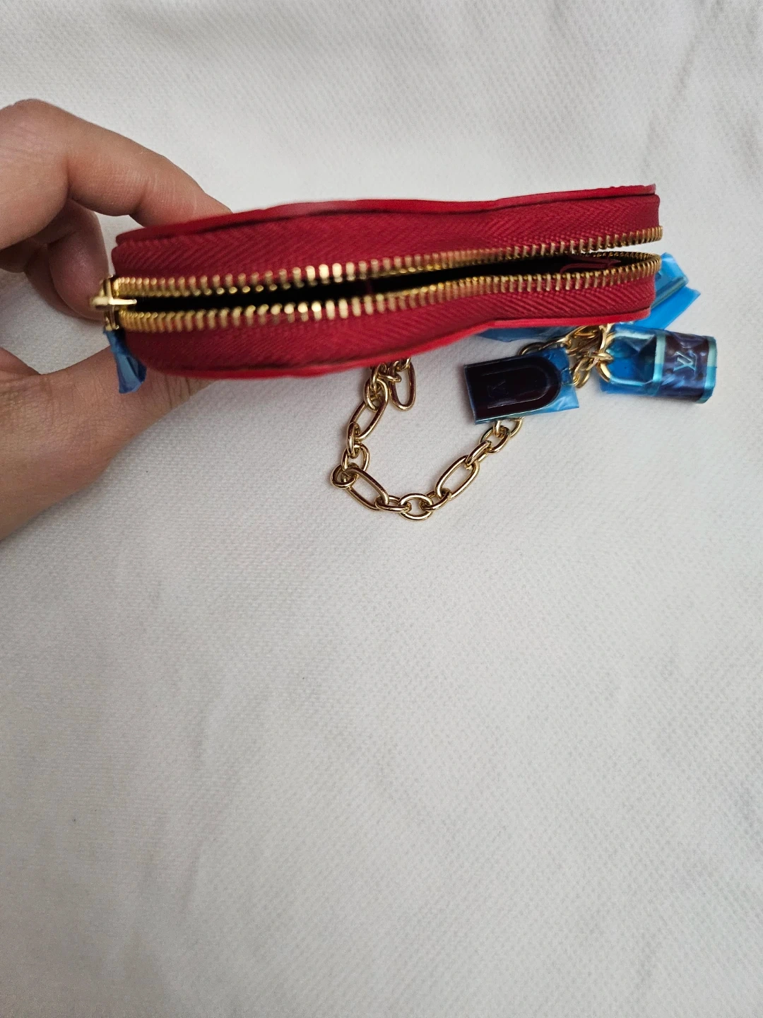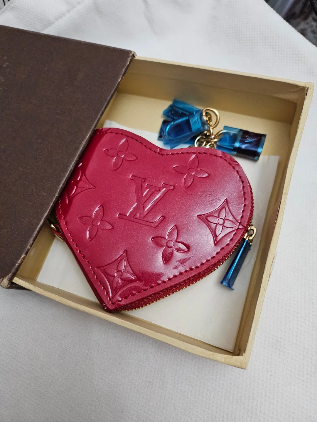 Super cute LV heart-shaped coin purse in a vibrant red! It comes with its original box and a charming chain with blue accents. Perfect for adding a touch of luxury to your everyday essentials