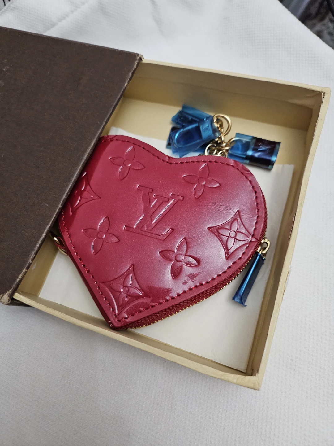 Super cute LV heart-shaped coin purse in a vibrant red! It comes with its original box and a charming chain with blue accents. Perfect for adding a touch of luxury to your everyday essentials